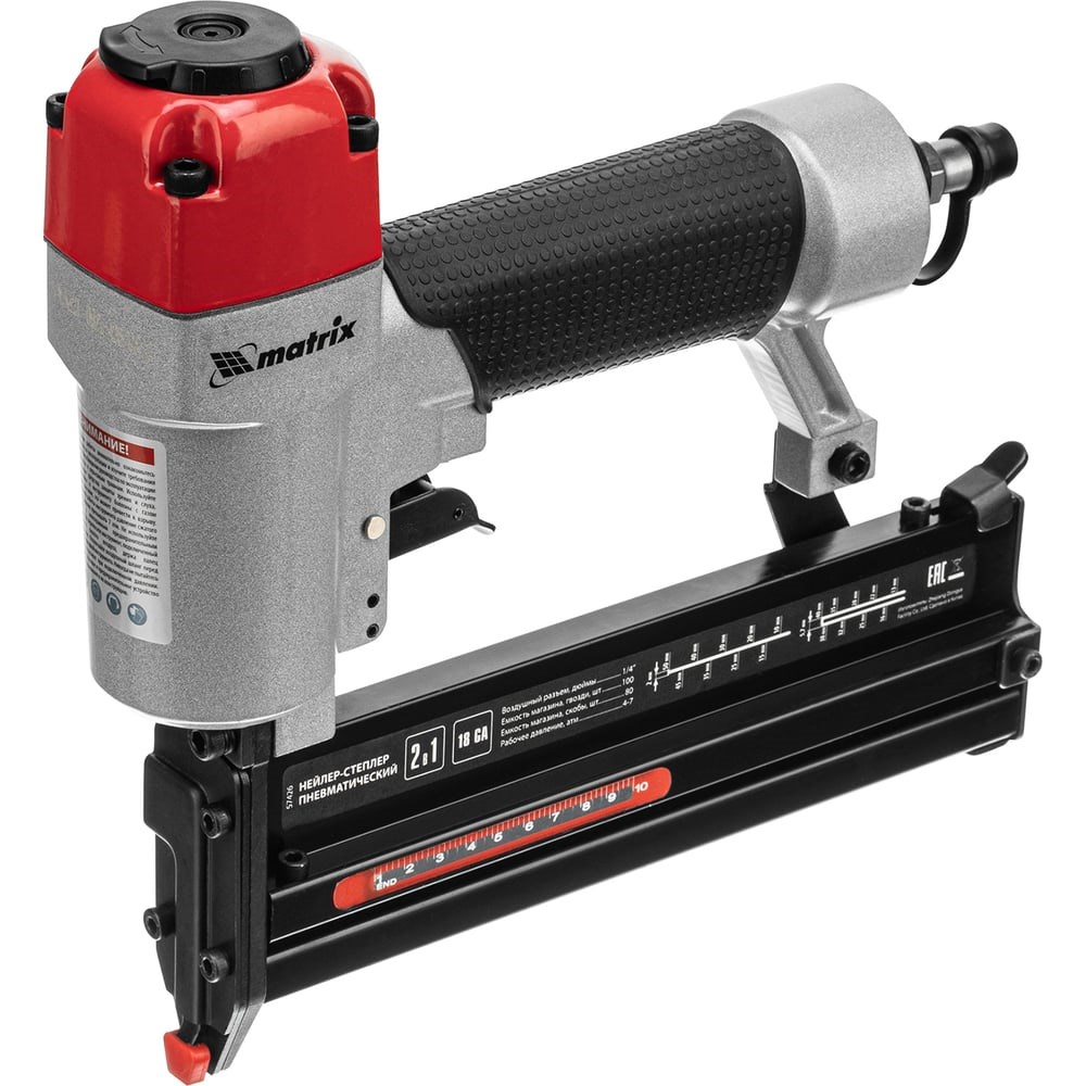 Пневматический нейлер-степлер 2 в 1 Matrix 57426 работает с двумя типами крепежей 18GA: гвоздями длиной 10-50 мм и скобами длиной 25-40 мм. Пригодится при сборке мебели и деревянных каркасов, для обшивки и утепления дома, при установке окон, дверей, плинтусов, напольных покрытий и для производства упаковки. Низкий расход воздуха 0,7 л/мин позволяет использовать инструмент с любыми типами компрессоров.