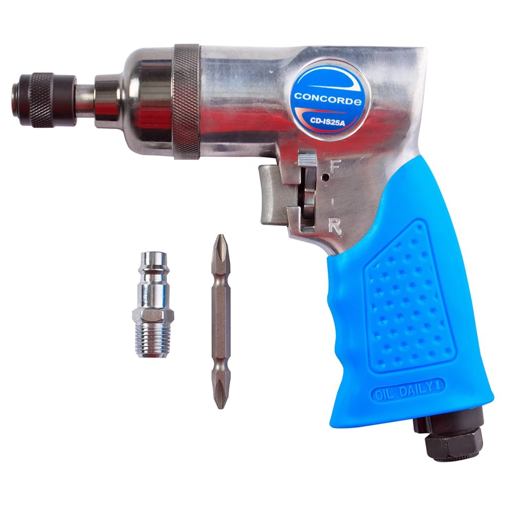 Пневматический ударный шуруповерт CONCORDE CD-IS25A 6670793 применяется в различных мастерских и в сборочных цехах для закручивания и выкручивания крепежных элементов: шурупов, винтов, саморезов. Рукоять с нескользящим покрытием (резиновая накладка), а также выступ на ее основании предотвращают выскальзывание инструмента из руки оператора. Быстрая и надежная фиксация насадок без дополнительных приспособлений. Реверс для вворачивания и выкручивания винтов и шурупов.