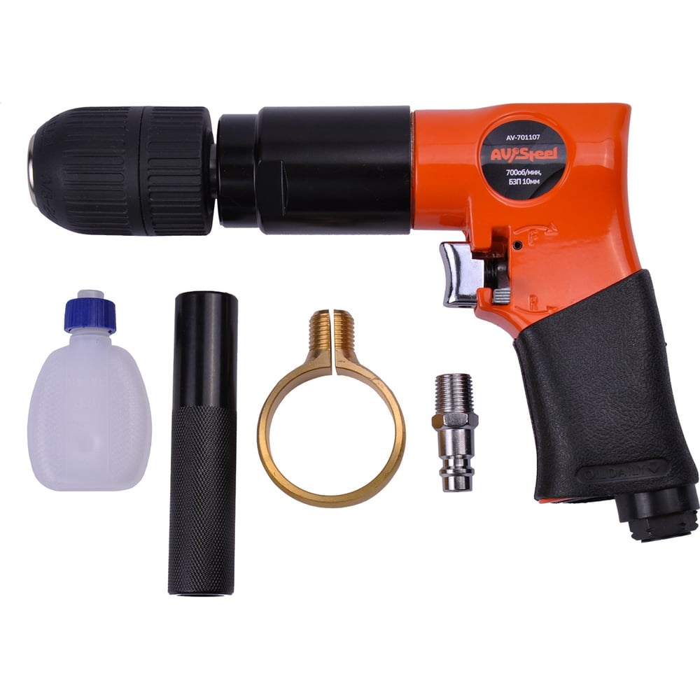 Пневмодрель AV Steel AV-701107 предназначена для сверления отверстий в различных материалах. Незаменима при сверлении металлов. Пневмодрель имеет реверс, что позволяет извлекать заклинившее сверло, а также работать со левосторонними сверлами. Оснащена быстрозажимным патроном до 13 мм для удобства и скорости смены сверл. В комплекте имеется дополнительная боковая рукоятка. Вращательный момент, создающийся пневмотурбиной, дает ряд достоинств: высокий ресурс, отсутствие перегрева, устойчивость к перегрузкам, возможность работать длительное время, а также высокую пожаробезопасность. Рекомендуется использовать подключение шлангом со внутренним диаметром не менее 8 мм.