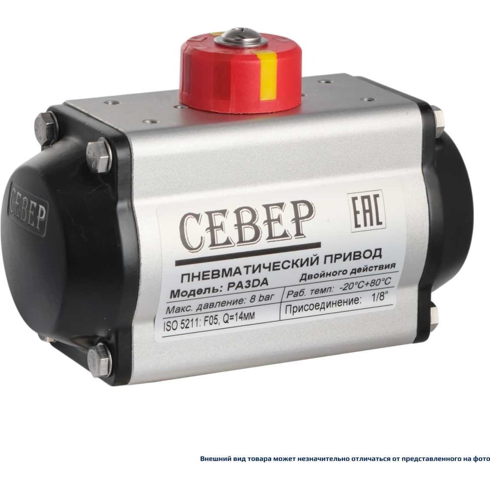 Пневмопривод Север двухстороннего действия PA3DA, ISO-фланец F05, шток арматуры 14х14, крутящий момент 35,2 Нм Корпус: алюминиевый сплав с анодным окислением с полиэстровым покрытием Конструкция: поршневой тип, зубчато-реечный механизм