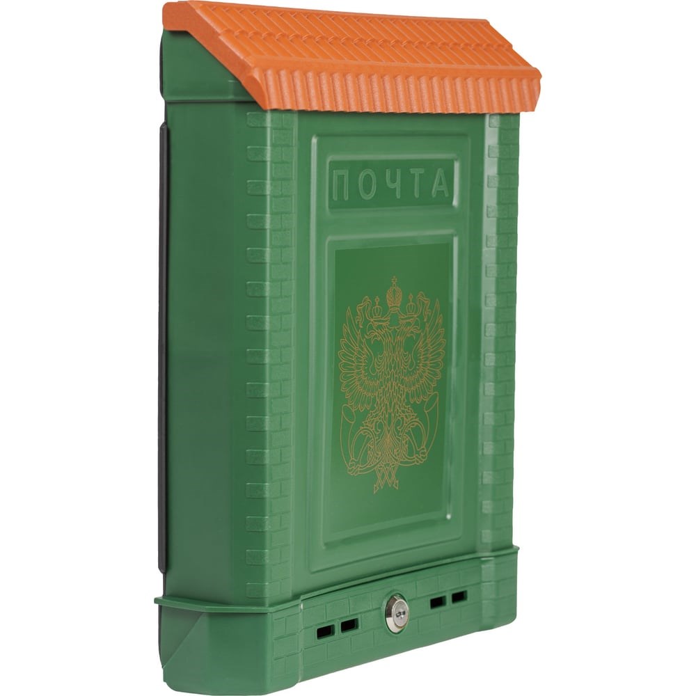 Почтовый ящик Цикл ПРЕМИУМ с металлическим замком, зеленый с орлом 4607156366026 укомплектован двумя ключами. Корреспонденция попадает внутрь через декоративную крышу, ее необходимо приподнять. Корпус зеленого цвета выполнен из морозостойкого пластика, что позволяет вешать ящик на улице на внешнюю часть забора.
