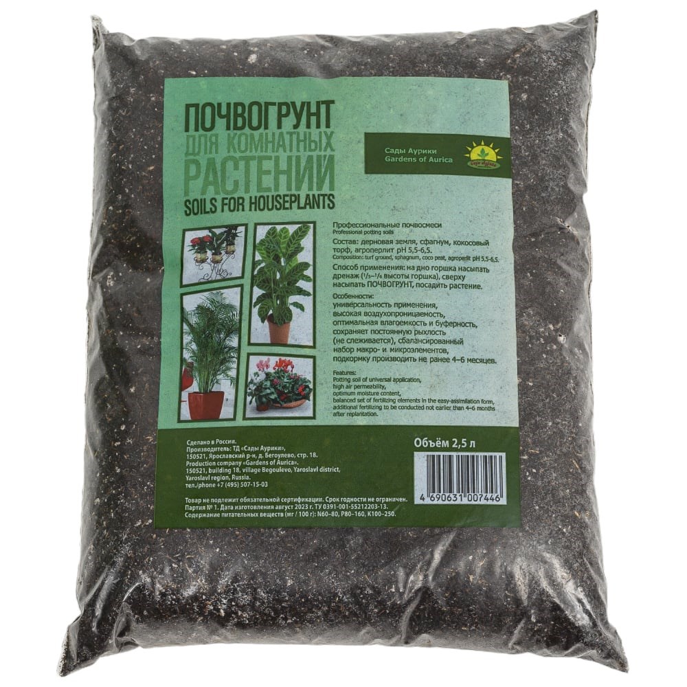 Почвогрунт для комнатных растений Сады Аурики 2.5 л 050852 - универсальный субстрат на основе дерновой земли. Обладает высокой воздухопроницаемостью, оптимальной влагоемкостью и буферностью. Сохраняет постоянную рыхлость (не слеживается), имеет сбалансированный набор макро- и микроэлементов.