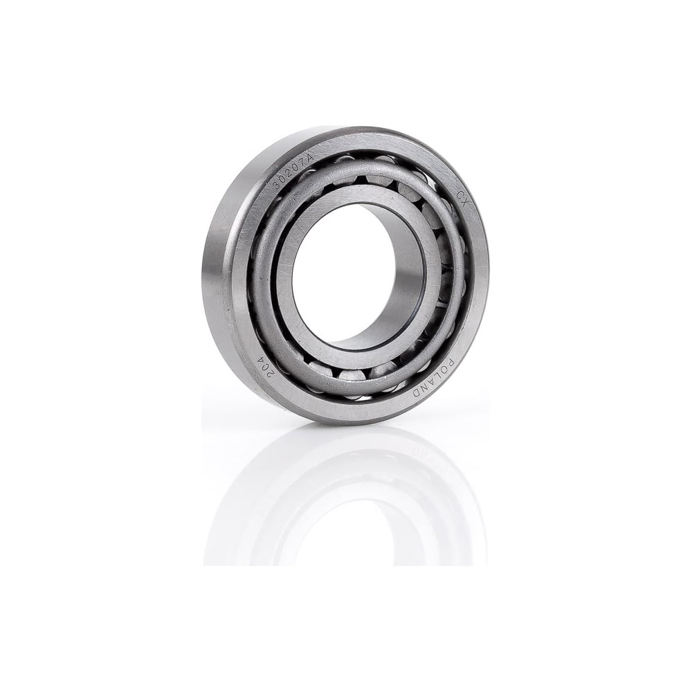Конический роликовый подшипник, однорядный, предназначен для эксплуатации в подшипниковых узлах с высокими радиальными и осевыми нагрузками, имеет возможность регулировки как осевого так и радиального зазора. Конические роликоподшипники имеют дорожки качения внутреннего и наружного колец, между которыми находится комплект конических роликов. Если образующие конических поверхностей продолжить, то они сойдутся в одной точке, которая находится на оси подшипника. Это означает, что условия качения являются оптимальными. Конические роликоподшипники хорошо воспринимают комбинированные нагрузки (радиальные и осевые). Способность подшипника нести осевую нагрузку в большей степени определяется углом контакта, который соответствует углу дорожки качения наружного кольца. Чем больше угол, тем больше грузоподъемность по осевой нагрузке. Конические роликоподшипники имеют разъемную конструкцию, т.е. внутреннее кольцо с роликами и сепаратором образуют блок, который может быть смонтирован отдельно от наружного кольца. Конические роликоподшипники бывают однорядные, двухрядные и четырехрядные. Но в основном производители выпускают однорядные конические роликоподшипники. Однорядные конические роликоподшипники способны воспринимать только односторонние осевые нагрузки. При радиальных нагрузках в подшипнике возникает осевое усилие, которому необходимо противодействовать.