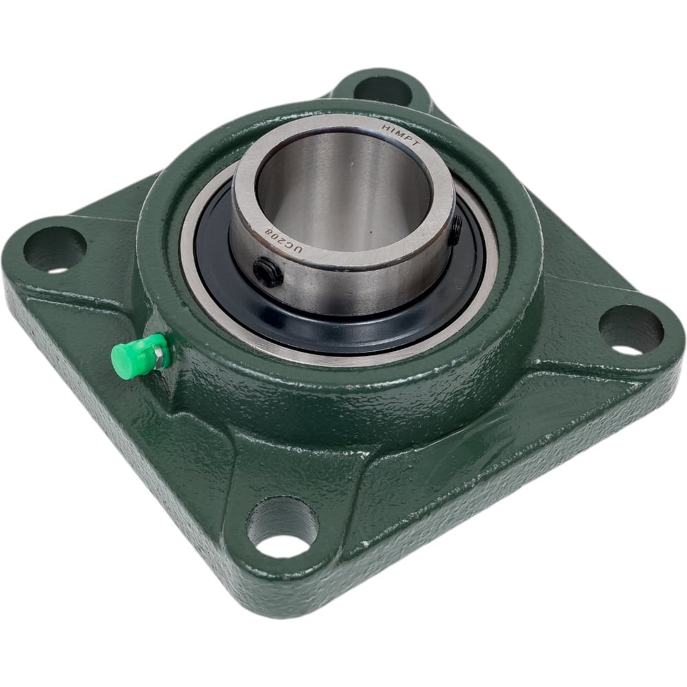 Подшипник шариковый радиальный однорядный с двумя уплотнениями, широким внутренним кольцом и установочным винтом во внутреннем кольце. Подшипник является самоцентрирующимся (самоустанавливающимся), так как корпус имеет сферическое посадочное отверстие, а сам подшипник сферическое наружное кольцо, что позволяет подшипнику слегка перемещаться в корпусе компенсируя перекос вала. Подшипник имеет отверстия и канавку для смазки, корпус комплектуется пресс-маслёнкой. Направление воспринимаемых нагрузок - радиальное и осевое в обе стороны. Монтаж на валу удобен и прост. Установлен в корпус F фланцевого типа. В зависимости от производителя подшипник UC может быть установлен в корпусе ровно либо с небольшим смещением (с преднатягом). При монтаже на вал подшипник принимает необходимое положение в посадочном отверстии.