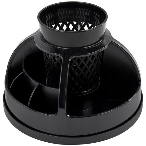 Эргономичная пластиковая подставка-органайзер размером 160х110 мм с 9 отделениями для пишущих принадлежностей и канцелярских мелочей. Легко вращается на 360°. Поставляется без канцелярского наполнения.