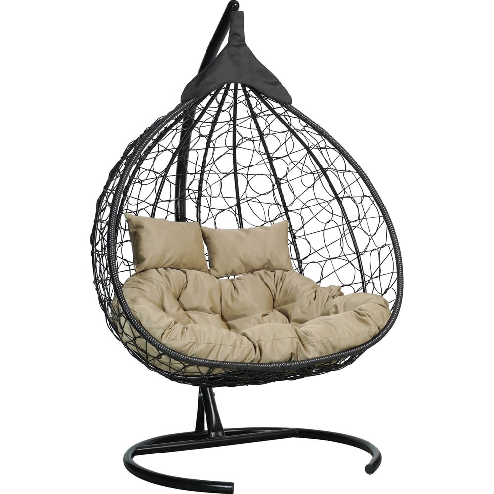 Подвесное двухместное кресло-кокон Лаура FISHT черное + черный каркас, подушка бежевая FIS