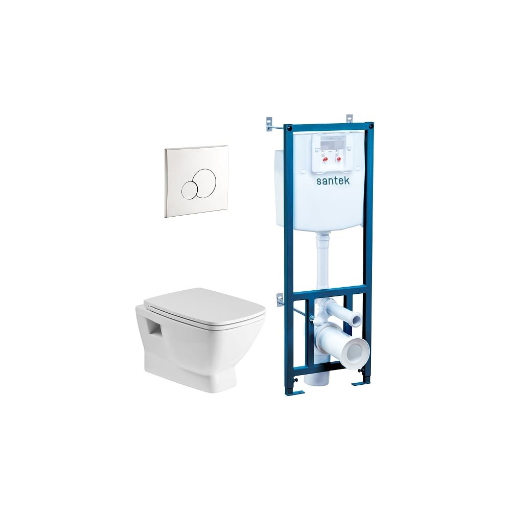 Подвесной безободковый унитаз Santek Пэк Нео Rimless с сиденьем, инсталляция 1WH501572 00057796 — совершенство формы и функционалаГлавные достоинства изделия:Фарфор высшего качества — корпус изделия выполнен из высококачественного фарфора, который отличается особой белизной, устойчивостью к загрязнениям и долговечностью.Каскадный омыв чаши — эффективная система омывания обеспечивает тщательную очистку внутренней поверхности чаши, исключая накопление загрязнений и неприятные запахи.Горизонтальный выпуск — обеспечивает быструю и простую установку в большинстве стандартных квартир и домов.Дюропластовое сиденье Soft-close Clip up — уникальное сочетание качеств мягкого закрытия и быстрой смены сиденья делает пользование унитазом комфортным и безопасным.Высокопрочная монтажная рама — рама изготовлена из прочного оцинкованного металла, способного выдержать вес до 400 кг, обеспечивая максимальное удобство и долговечность.Экономия воды — двухуровневая система слива позволяет выбрать подходящий объём воды для эффективного удаления отходов: 6 литров для обычного слива и 3 литра для экономичного.Бесшумность работы — низкое давление наполняющего клапана сводит к минимуму шумы, возникающие при заполнении резервуара, даря чувство покоя и комфорта.Антибактериальные свойства — коэффициент водопоглощения менее 0,5% препятствует проникновению бактерий и загрязнителей внутрь материала, обеспечивая чистоту и свежесть в течение долгого времени.