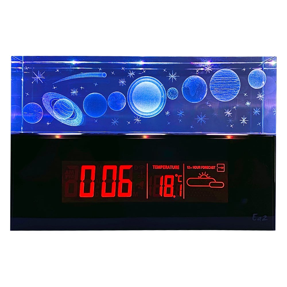 Погодная станция Ea2 Solar BB104S – функциональное дизайнерское устройство для использования дома, или в офисе. Благодаря использованию цельного стеклянного кристалла с 3D гравировкой и строгим пропорциональным линиям корпуса, станция выглядит очень презентабельно является прекрасным вариантом корпоративного подарка, который точно не отправится обратно в коробку. Метеостанция обладает достаточно полным функционалом, но в то же время требует минимальных усилий для настройки. Пользователь получает часы, будильник, календарь, прогноз погоды и измерение внутренней температуры в стильном устройстве, которое вписывается практически в любой интерьер. Он также может менять по своему вкусу цвет подсветки 3D изображения планет Солнечной системы и яркость экрана.
