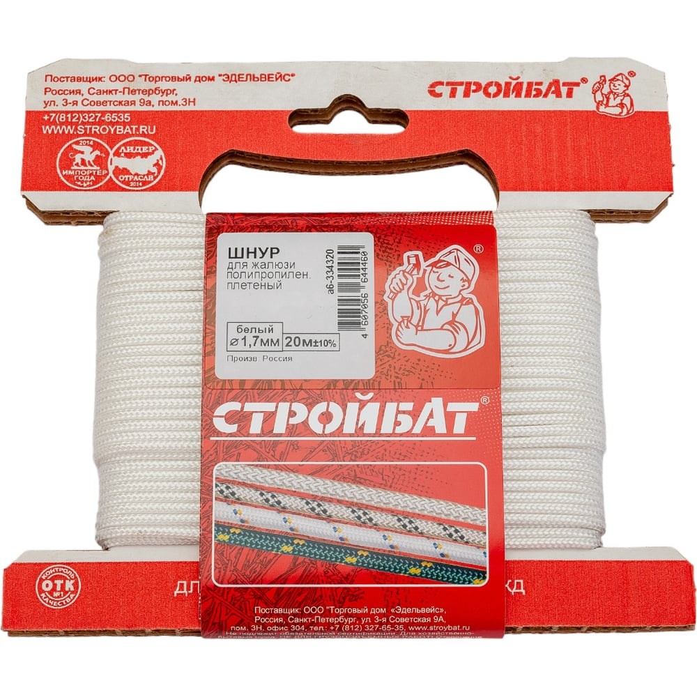 Полипропиленовый плетеный шнур для жалюзи Стройбат 1.7 мм белый 20 м 334320 применяется для рукоделия и хозяйственно-бытовых целей. Устойчив к высоким и низким температурам, поэтому может использоваться в любое время года. Выполнен из полипропилена, за счет чего выдерживает многократные изгибы. Благодаря износостойкости шнур устойчив к большим нагрузкам.