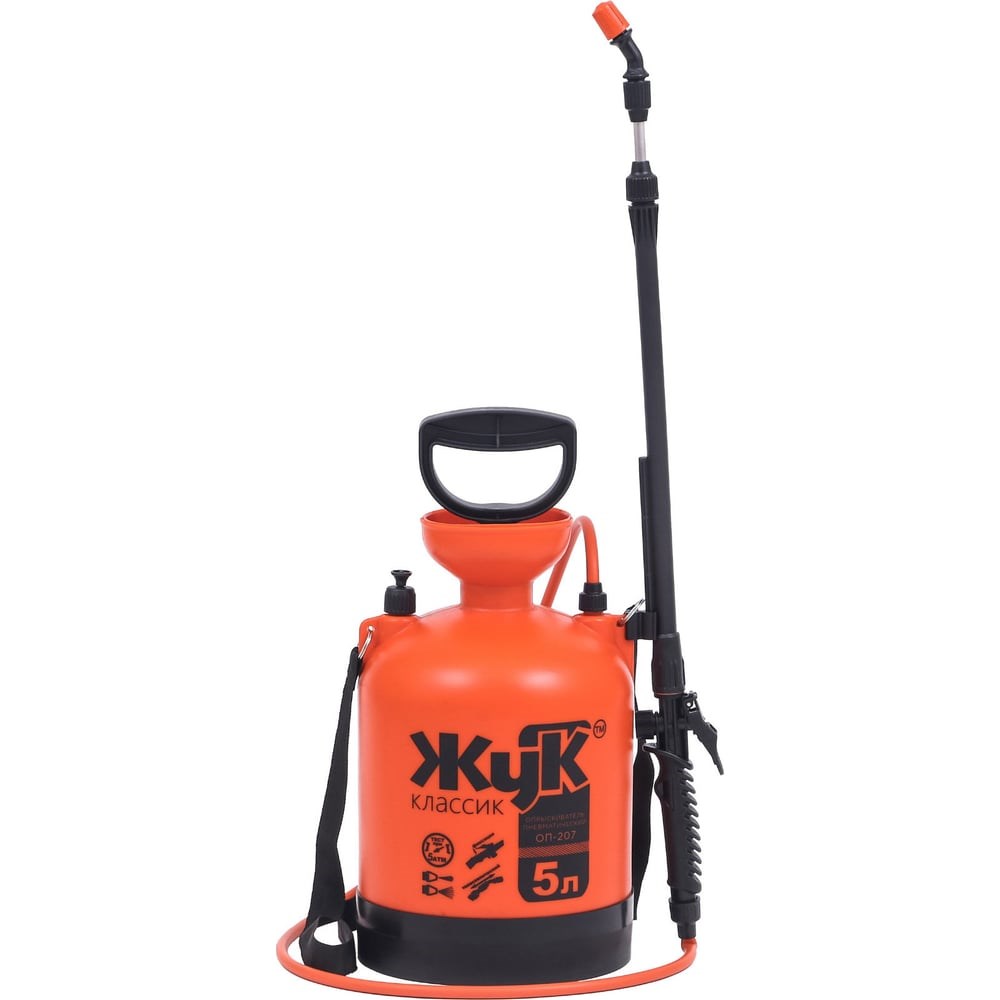 Опрыскиватель Cicle Жук Классик 5 л 4607156360437 - аппарат, предназначенный для внесения жидких удобрений, бережного орошения растений, как садовых, так и домашних. Может применяться для распыления чистящего средства при мытье стен, окон. Объем бака для жидкости - 5 л. Емкость изготовлена из высококачественного пластика. Благодаря плечевым рукояткам опрыскивателем удобно пользоваться даже при обработке значительных территорий. Штанга телескопическая (ее длина регулируется от 650 до 970 мм).
