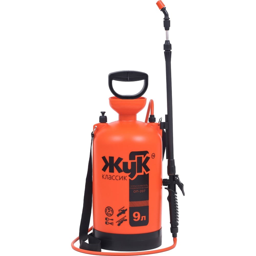 Опрыскиватель Жук Классик 9 л 4607156360406 используется для орошения, внесения жидких удобрений, подкормки садовых или домашних растений. Также может применяться для распыления чистящего средства при мытье стен, окон, дезинфицирующего раствора. опрыскиватель вмещает 9 литров жидкости. Корпус изготовлен из высококачественного пластика. Возможна регулировка струи распыления, вращая наконечник распылителя: от мелких брызг до направленной струи. Благодаря плечевым рукояткам опрыскивателем удобно пользоваться даже при обработке значительных территорий. Штанга телескопическая (ее длина регулируется от 650 до 970 мм).