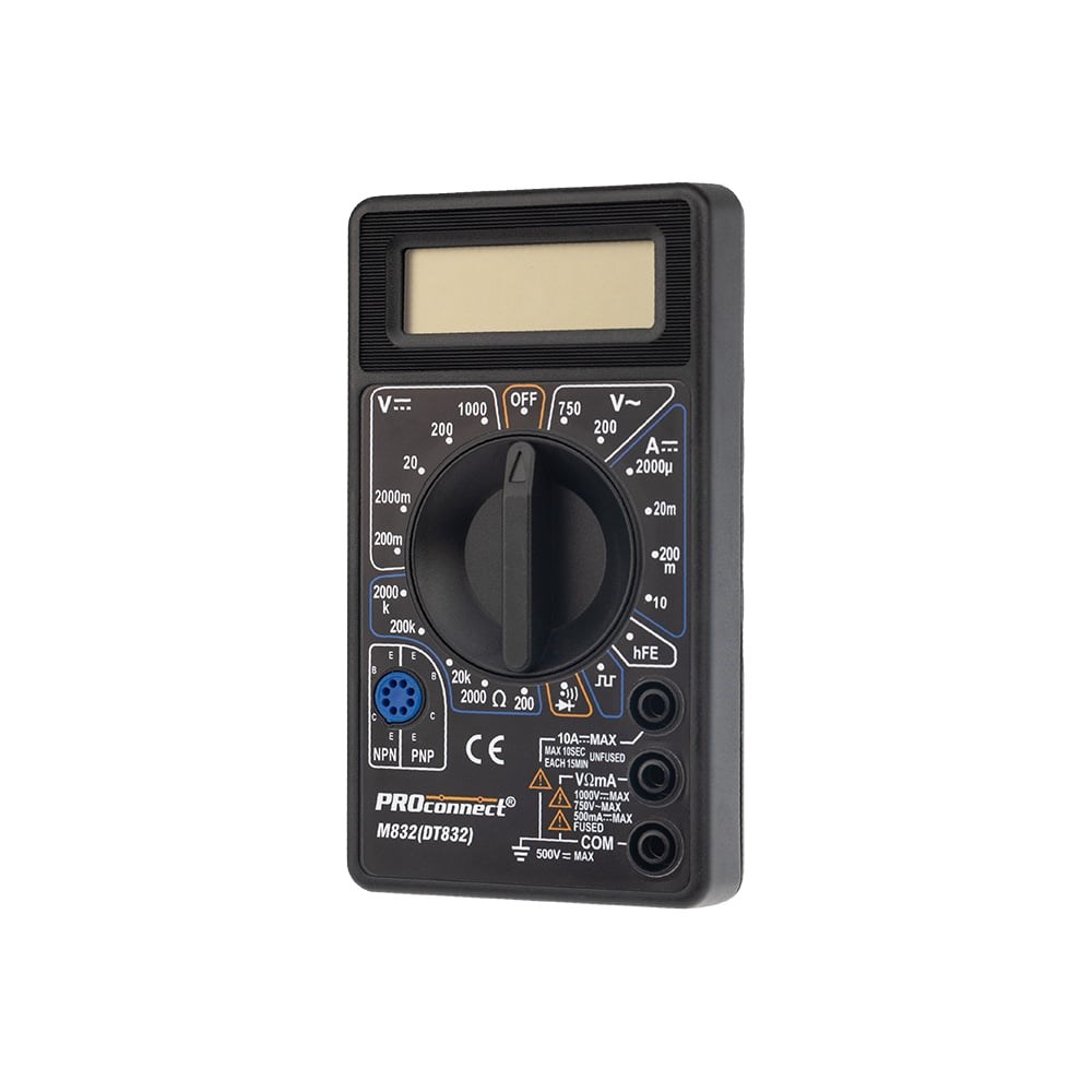 Мультиметр включает в себя несколько функций и набор измеряемых параметров. Все приборы серии M832 измеряют постоянное и переменное напряжение, постоянный ток и сопротивление в цепи. Также с помощью данного прибора можно проводить тестирование диодов, и осуществлять прозвонку целостности цепи. Еще одной отличительной особенностью данного прибора является функция генерирования прямоугольных сигналов (меандр), эта функция нужна для измерений и преобразований сигнала и в других областях.M832 является портативным мультиметром, компактные размеры позволяют всегда носить его с собой. Но несмотря на малые размеры, данный мультиметр обладает широким функционалом и это выгодно отличает его от других. Выбор измеряемых величин и пределов измерений производится с помощью усиленного поворотного регулятора, благодаря которому исключается возможность случайного нажатия. Прибор изготовлен из высококачественных материалов, калибровка и тестирование приборов произведены под контролем компании СДС.Характеристики:Постоянное напряжение: 200 mВ (±0.5%+3), 2000 мВ/20 В/200 В (±0,8%+5), 1000 В (±1,0%+5);Переменное напряжение: 200 В/750 В (±2,0%+10);Постоянный ток: 200 мкА/2000 мкА/20 мА (±1.8%+2), 200 мА (±2,0%+2), 10 A (±2.0%+10);Сопротивление: 200 Ом (±1,0%+10), 200 Ом/20 КОм/200 КОм/2000 КОм (±1,0%+4);Тестирование диодов;Прозвонка целостности цепи;Генератор прямоугольного сигнала (меандр);3,5-разрядный дисплей;Размер: 70х126х26 мм;Тип батареи: PROconnect 9 В «Крона» (в комплекте);Вес: 108 г.