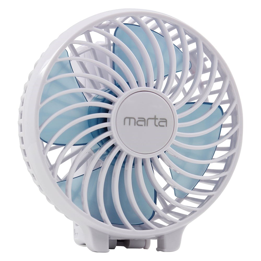 Портативный USB вентилятор Marta работает от встроенного литий-ионного аккумулятора ёмкостью 1800 мА/ч (типоразмер 18650) Время работы от аккумулятора до 7 часов Складная ручка Три скорости работы LED-индикатор работы и зарядки Петля для подвешивания Зарядка аккумулятора от USB порта, кабель USB-microUSB в комплекте Компактные размеры и складная ручка сделает вентилятор незаменимым как дома, так и в дороге