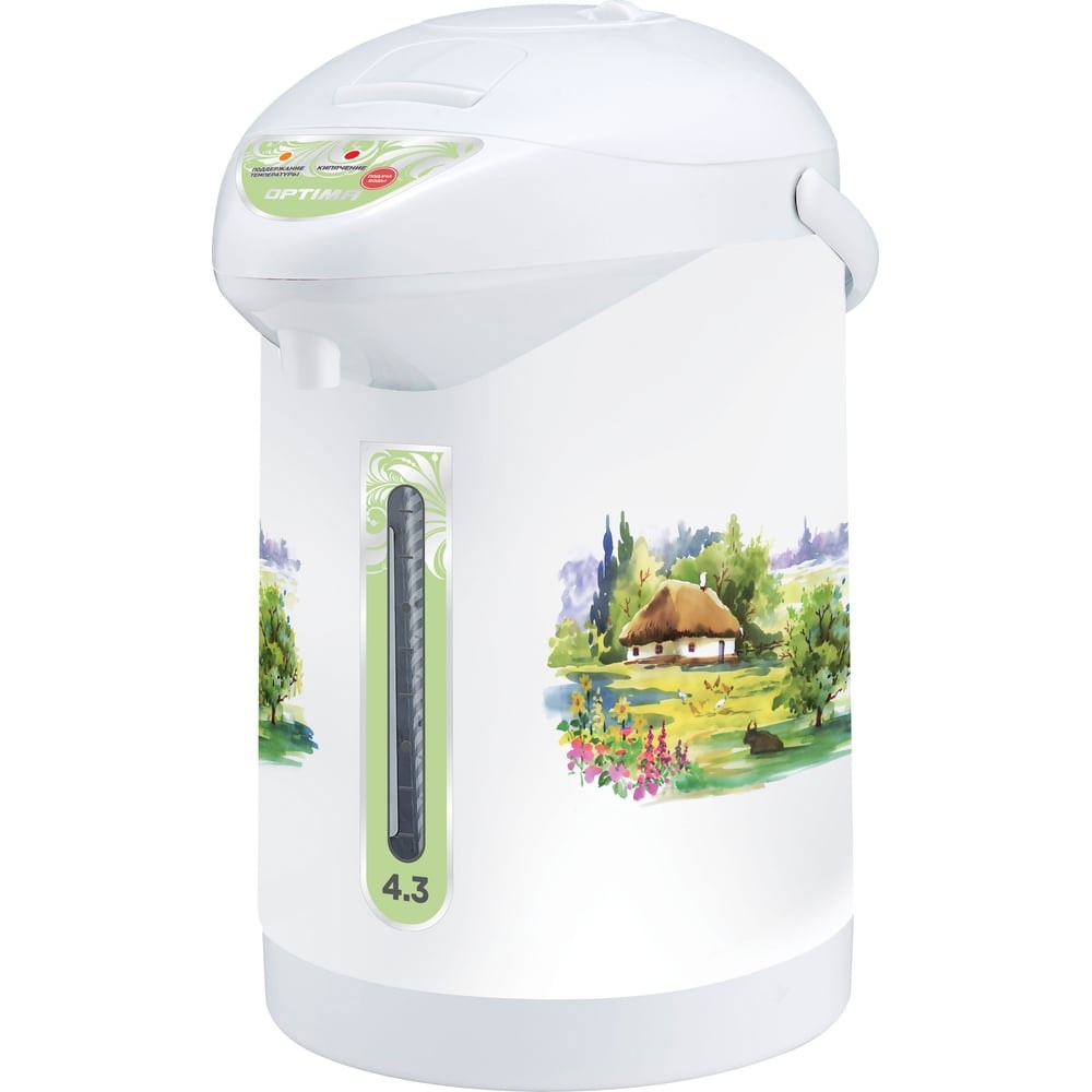 Поттер Optima AP-433R / 4.3л 3 сп. нал. воды бак из нерж.стали белый пластик 800Вт / 2000570 обеспечивает нагрев воды и длительное сохранение тепла. Подходит для использования дома и на работе. Экономит энергию за счет уменьшения теплоотдачи. Корпус выполнен из нержавеющей стали - надежно защищен от коррозии, увеличивает срок службы чайника. Имеет объем 4,3 литра, оснащен индикаторами уровня воды и нагрева, функцией поддержания температуры и защиты от перегрева. Чайник-термос снабжён пластиковой ручкой для удобства переноса. На верхней части поттера расположена и панель управления. Кнопка «ПОДАЧА ВОДЫ» включает электронасос и подаёт воду в чашку. На панели управления расположены два световых индикатора. Индикатор «поддержание температуры» сигнализирует о готовности чайника-термоса к работе, индикатор «кипячение» показывает процесс нагрева воды.