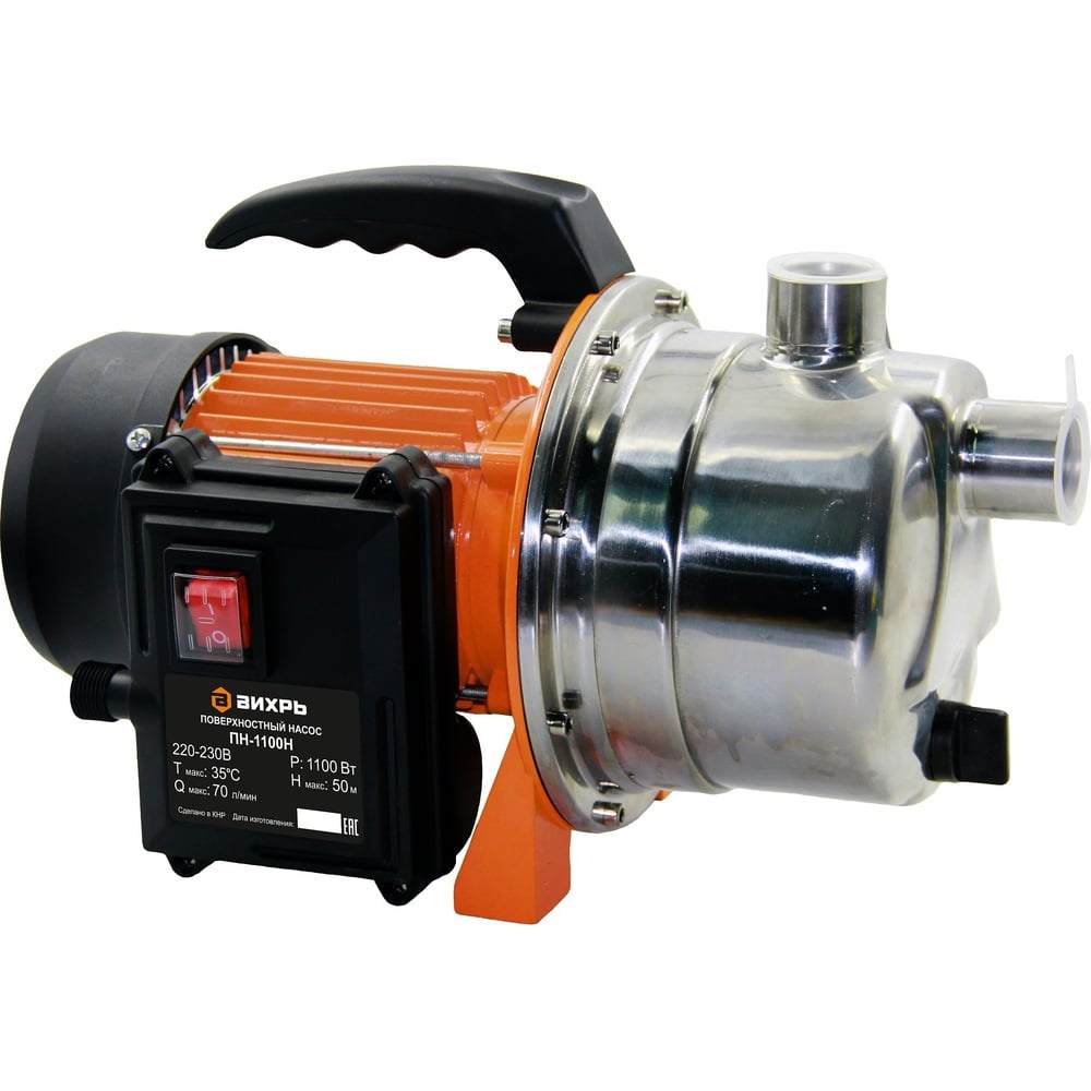 Поверхностный насос Вихрь ПН-1100Н центробежного типа подходит для перекачки чистой воды, в которой содержание механических частиц не превышает 150 г/м³. Электродвигатель мощностью 1100 Вт способен выкачивать воду с глубины до 9 метров и поднимать ее на высоту до 50 м. Его корпус выполнен из нержавеющей стали и устойчив к коррозии. Количество срабатываний двигателя в час ограничено 20 пусками. Это продлевает срок его службы. Насос оснащен эжектором. Производительность модели Вихрь ПН-1100Н составляет до 70 л/мин. График зависимости напора от высоты подачи воды указан в паспорте изделия.Поверхностный насос легко переносить за ручку, его вес 8 кг. Благодаря ножкам его можно установить на любой горизонтальной поверхности рядом с водоемом или колодцем. Входной и выходной патрубки имеют резьбу для штуцеров под шланги диаметром 1 дюйм. На корпусе расположены верхнее заливное и нижнее сливное отверстия. Перед включением в насосный отсек заливается вода. Не допускается работа всухую и попадание воздуха во всасывающее отверстие. При длительном простое воду необходимо слить, отсек промыть и просушить..Внимание! Внешний вид товара может отличаться от представленного на фото. Насос поставляется в двух вариантах: с металлической ручкой, с пластиковой ручкой.