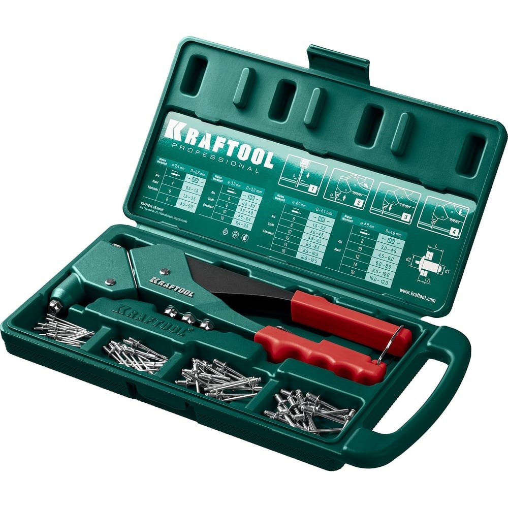Литой поворотный заклепочник KRAFTOOL RX-7 360° в кейсе, 2.4 - 4.8 мм 31176-H6_z01 выдерживает высокие рабочие нагрузки и предназначен для установки заклепок из алюминия, стали и нержавеющей стали различных диаметров. Применяется для установки вытяжных заклепок. Используется с алюминиевыми заклепками диаметром 2,4, 3,2, 4,0, 4,8 мм, стальными и нержавеющими заклепками диаметром 2,4, 3,2, 4,0 мм.