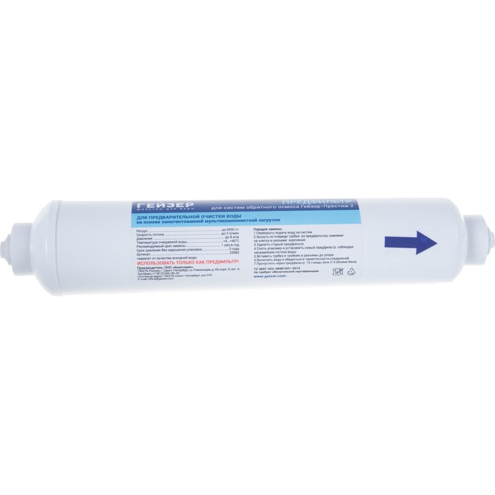 Предфильтр для Престиж-2 Гейзер 25582 - фильтрующий блок для предварительной очистки воды в системах обратного осмоса Гейзер Престиж 2. Предфильтр разработан на основе комбинированной фильтрующей загрузки. Обеспечивает защиту осмотической мембраны от губительного воздействия соединений железа, тяжелых и радиоактивных металлов, свободного хлора. Температура очищаемой воды 4 – 40 °С Ресурс до 6000 л. (6-12 месяцев в зависимости от качества исходной воды)
