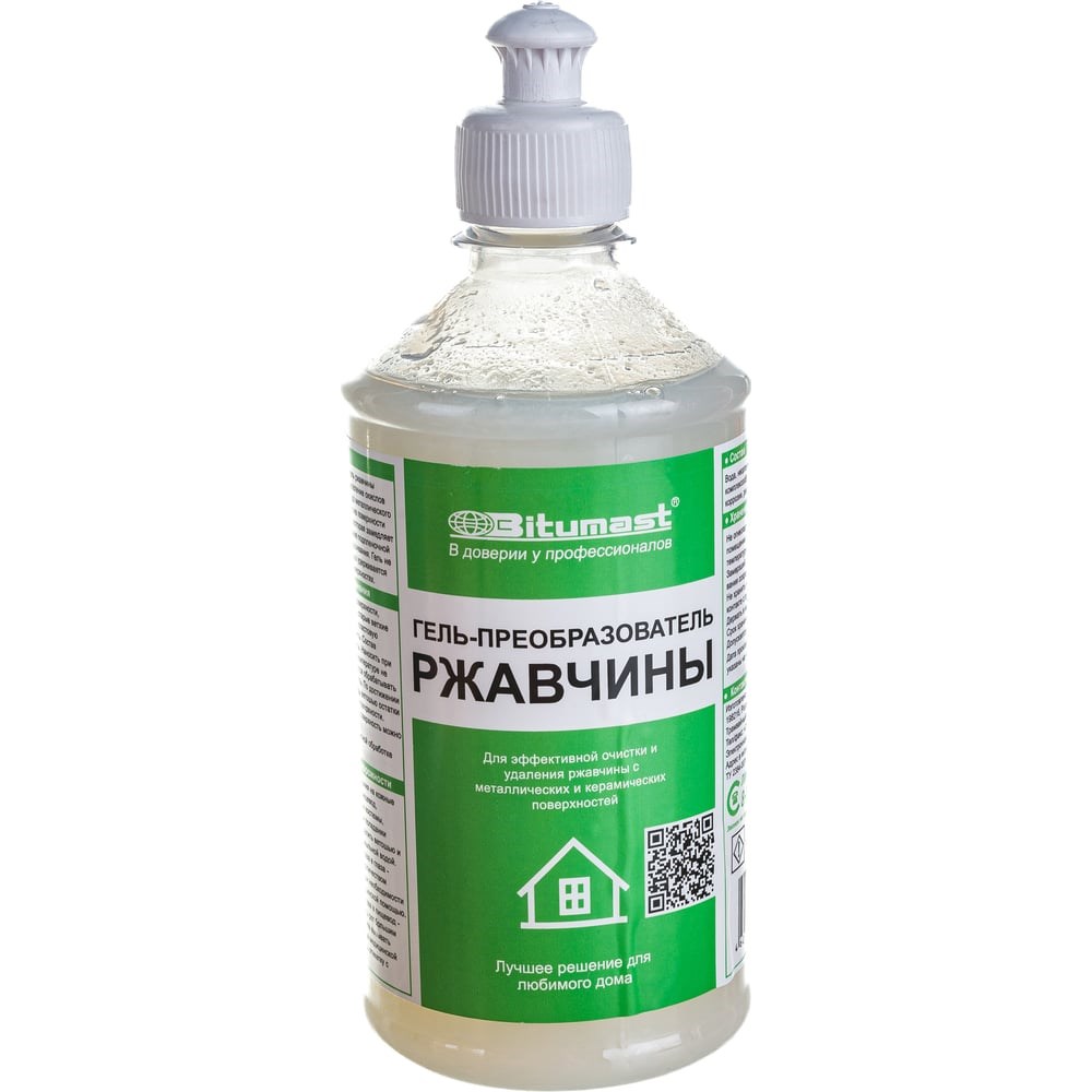 Гель-преобразователь ржавчины 0.5 л Bitumast 4607952901025 эффективно удаляет ржавчину на металлических поверхностях. Применение: зачистить и обезжирить обрабатываемую поверхность. Средство тщательно взболтать и нанести при помощи кисти на поверхность, оставить на 10 - 15 минут, затем удалить остатки при помощи ветоши. Обработанную поверхность протереть растворителем.