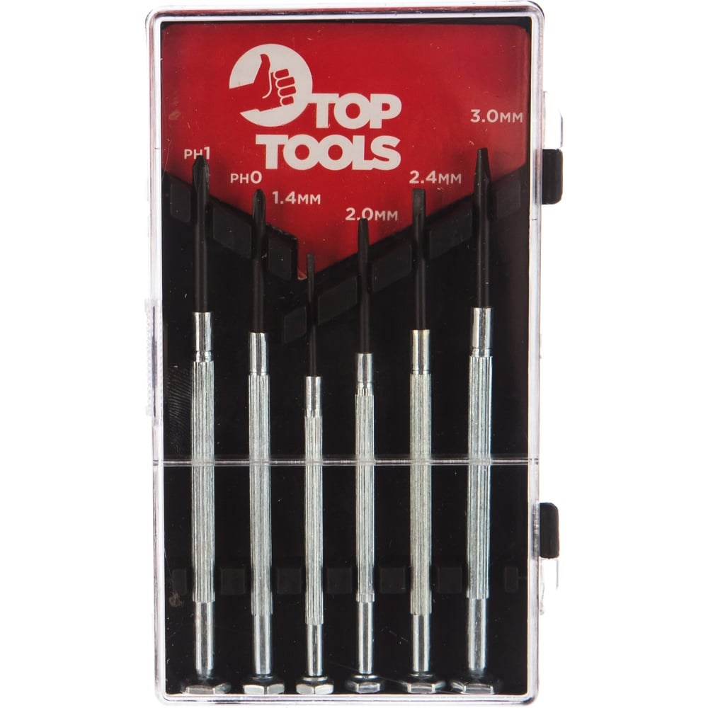 Набор прецизионных отверток, 6 шт. Top Tools 39D193 поставляется в удобном пластиковом футляре. Комплект используется для работ с крепежом. Рабочие части изготовлены из закаленной углеродистой стали.