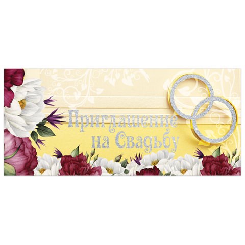 Изготовлено из высококачественного картона плотностью 215 г/м2. Выполнено в кремовых оттенках с изображением белых и бордовых цветов цветов и обручальных колец. Для удобства предоставлен блок информации, куда можно вписать необходимые данные: адрес и время проведения торжества. Размер – 96х210 мм (в развороте 96х420 мм).