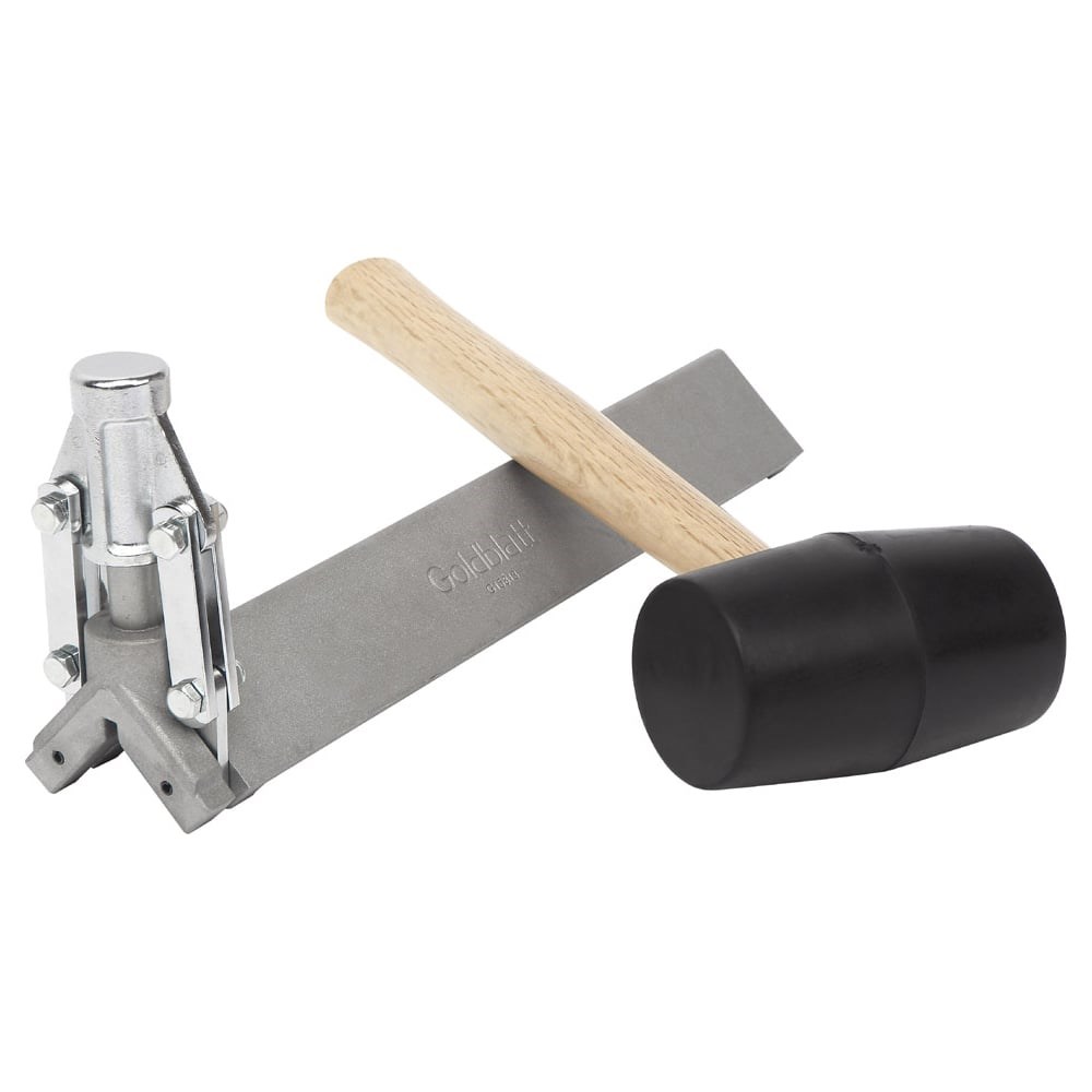 Приспособление для установки уголков позволяет быстро устанавливать металлические уголки при работе с гипсокартоном. В комплекте поставляется киянка с мягким резиновым бойком для рихтовочных работ.
