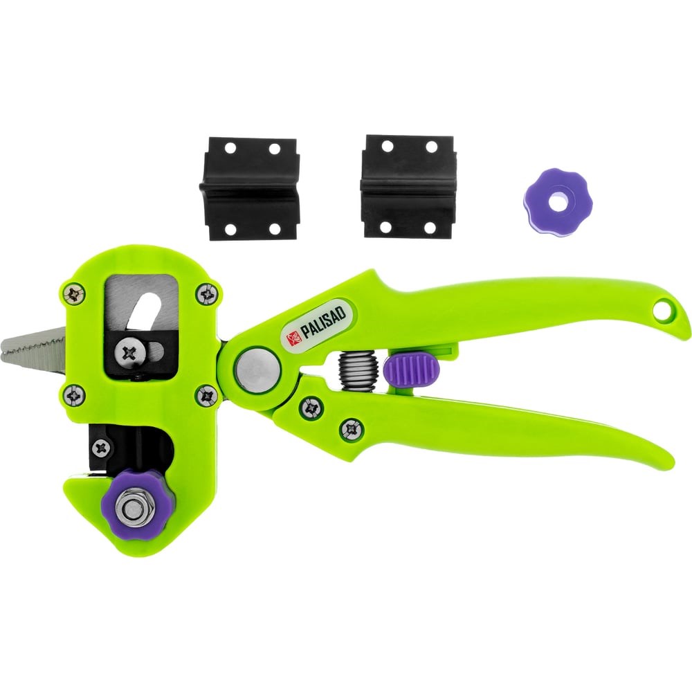 Прививочный секатор Palisad 60502 длиной 215 мм, со сменными ножами, используется для прививки плодовых растений черенком. Фигурные ножи секатора изготовлены из рессорно-пружинной стали, поэтому обладают высоким ресурсом (рассчитаны на 5000 срезов без дополнительной заточки). В комплекте U-образный, V-бразный и Ω-образный ножи, что позволяет работать с черенками различной толщины и плотности. Вырезы, сделанные на подвое и привое, идеально совместимы друг с другом, дополнительная подгонка им не требуется.