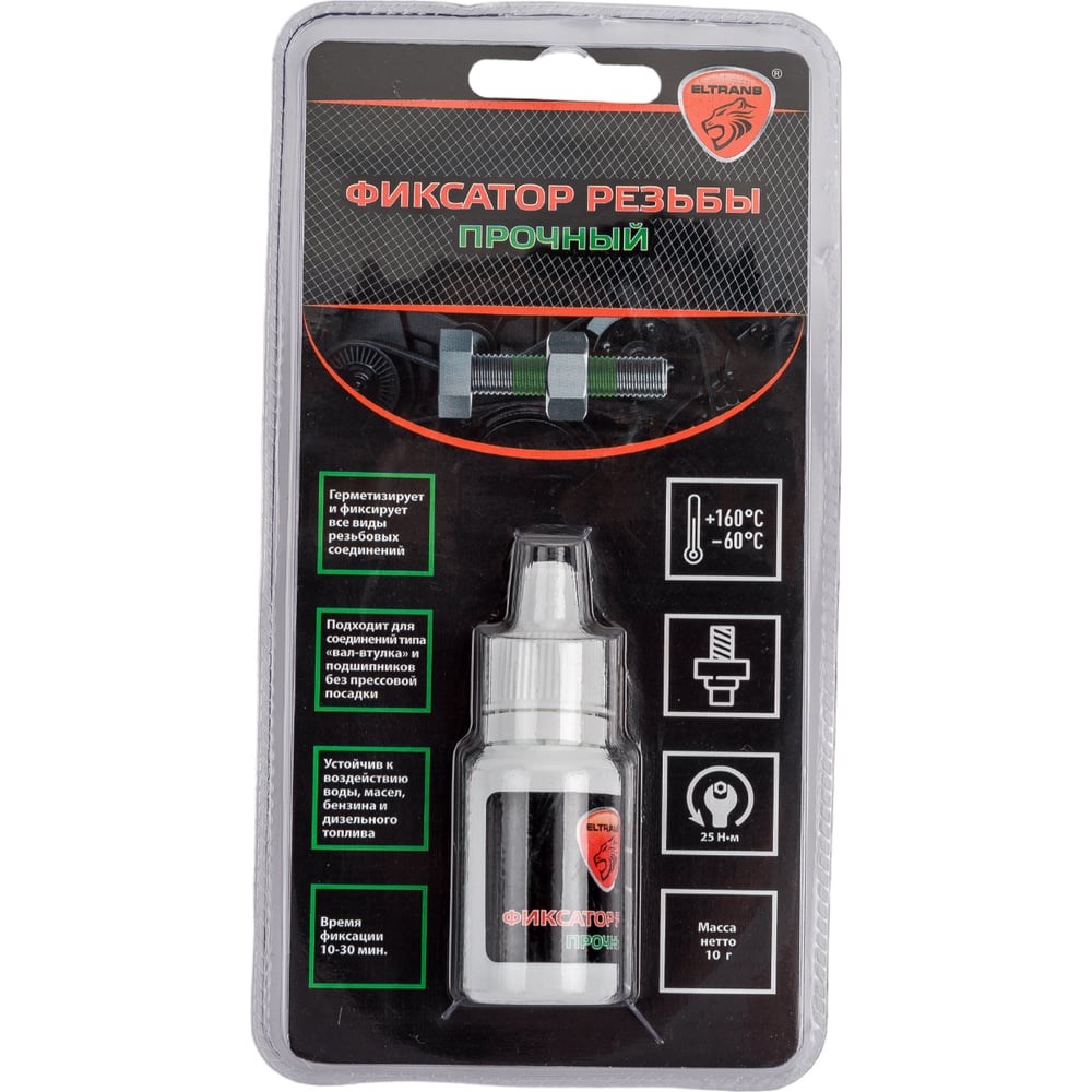 Прочный герметик - фиксатор резьбы ELTRANS ПВД флакон в блистере, 8 мл EL-1231.01 предназначен для герметизации и фиксации резьбовых соединений, требующих разборки только в случае капитального ремонта. Продукт подходит для соединений вида вал-втулка, фиксации подшипников без прессовой посадки. Анаэробный состав предотвращает возникновение коррозии. Герметик устойчив к воздействию воды, газов, машинного масла, антифриза и любых видов топлива.