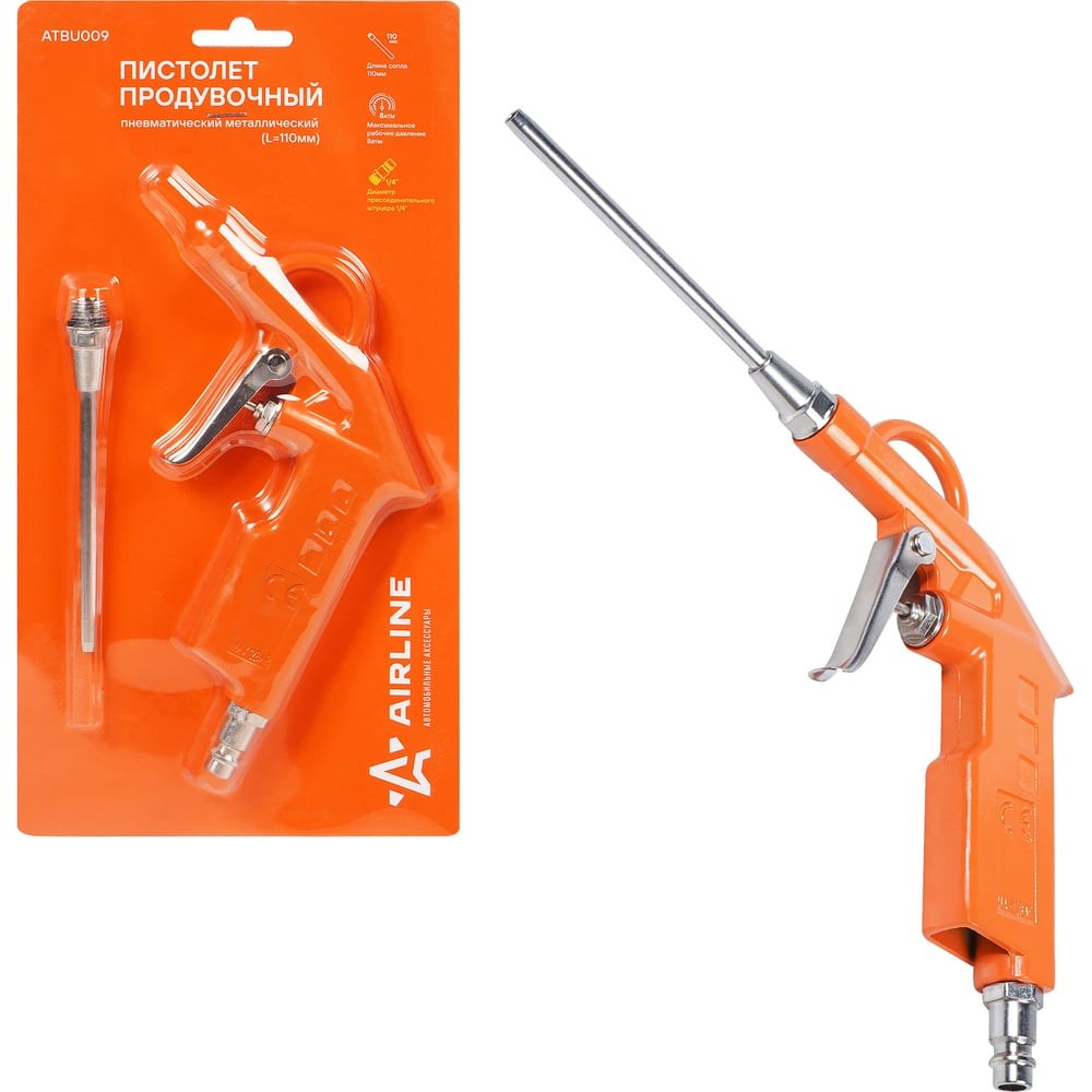 Пистолет продувочный пневматический металл. (L=110мм) AIRLINE ATBU009 имеет корпус, изготовленный из ударопрочного алюминиевого сплава. В комплект входит присоединительный фитинг 1/4".
