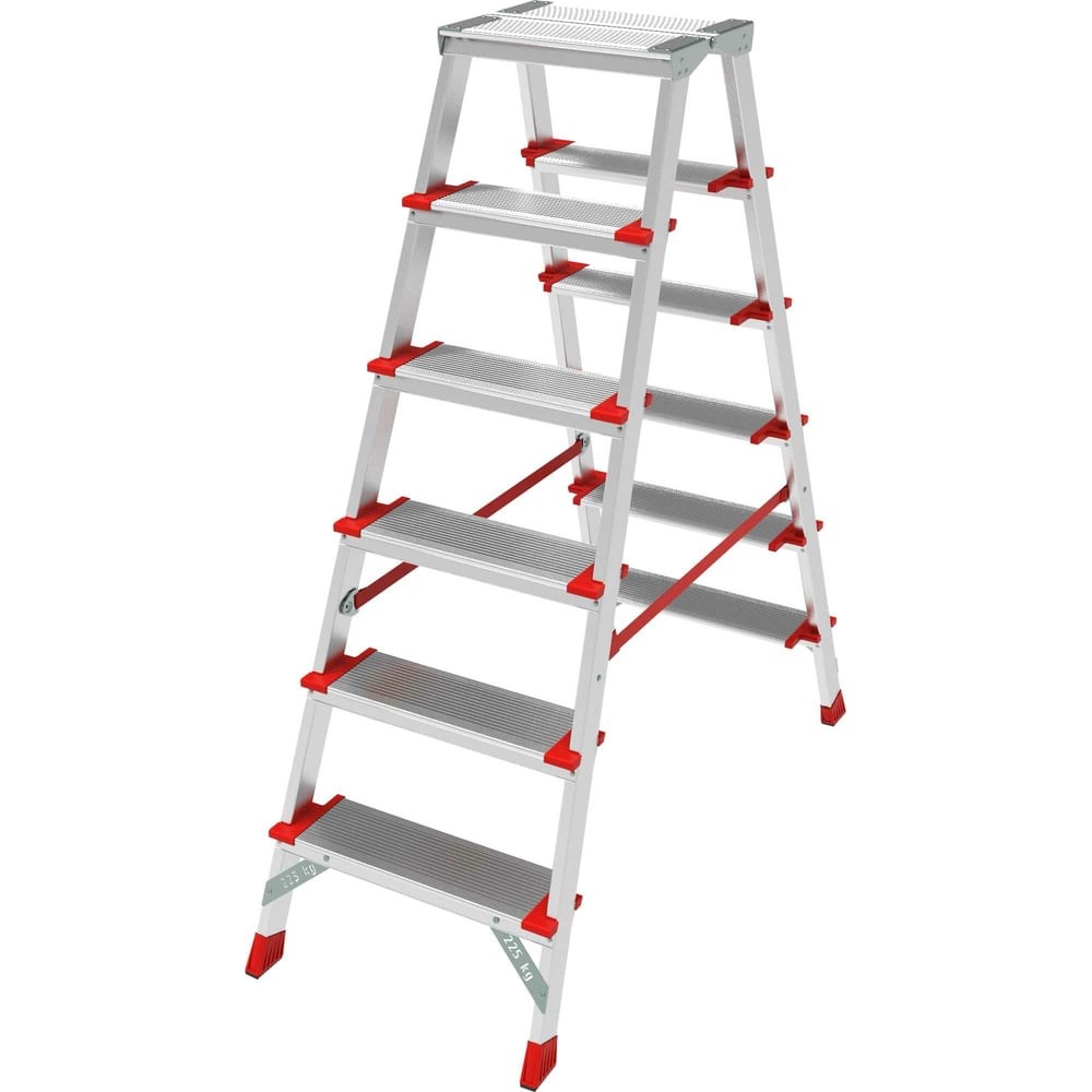 Профессиональная стремянка Новая Высота NV3127, 2x6 ступеней 130 мм, площадка 350x260 мм 3127206 предназначена для интенсивного использования. При небольшом весе модель обладает максимальной прочностью и надёжностью. Она легко устанавливается и обеспечивает высокий уровень комфорта Ориентация ступеней на обе стороны позволяет работать, не переставляя стремянку и тем самым экономя время. Стойки и ступени выполнены из экструдированных алюминиевых профилей увеличенного сечения, что обеспечивает надежность конструкции. Для более высокой устойчивости конструкции предусмотренно прочное крепление ступеней к боковинам шестью заклёпками. Рифлёная поверхность ступеней обеспечивает безопасный подъём и спуск. Опорные наконечники из прочного пластика гарантируют устойчивое положение стремянки на поверхности.