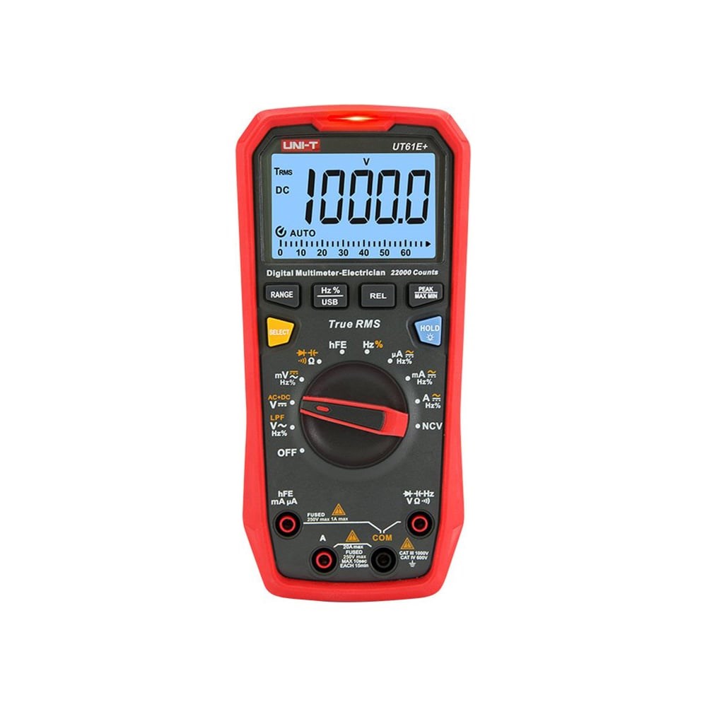 Профессиональный TRUE RMS мультиметр последнего поколения UNI-T UT61E+ с ударопрочным корпусом применяется для измерения постоянного/переменного напряжения, силы тока, сопротивления, емкости и частоты с большим разрешением и точностью. Присутствует фильтр низких частот для переменного напряжения и аналоговая шкала. Большой дисплей на 22 000 разрядов с подсветкой облегчает считывание результатов при слабом внешнем освещении. Функция удержания данных обеспечивает удобство при работе в местах с ограниченным доступом. Выбор диапазона измерения производится автоматически или вручную. В устройстве предусмотрена прозвонка межсоединений со звуковым сигналом, подсветка дисплея, диодный тест, защитный холстер и тест транзисторов. Во всех приборах серии имеется USB интерфейс и кабель для работы с ПК. Прибор имеет режимы относительных, максимальных/минимальных измерений. Оснащен функцией сохранения показаний DATA HOLD, индикацией режима измерений и разряда батареи.
