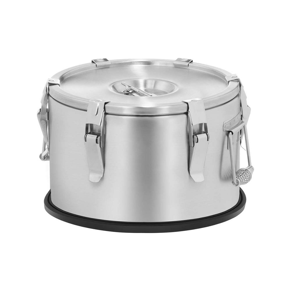 Профессиональный термос Viatto 10 л, 300x170 мм va-tp10ss 173429 изготовлен из нержавеющей стали. Предназначен для транспортировки продуктов питания с сохранением температуры Благодаря одинаковому диаметру всех моделей и наличию пластикового основания термосов VIATTO, модели разного объема стопируются друг на друга, что удобно при перевозке и хранении. Крышка термосов крепится с помощью 6 заклепок и оснащена специальным клапаном. При заливе кипятка через 6 часов хранения температура жидкости снизится примерно до 65 °C.