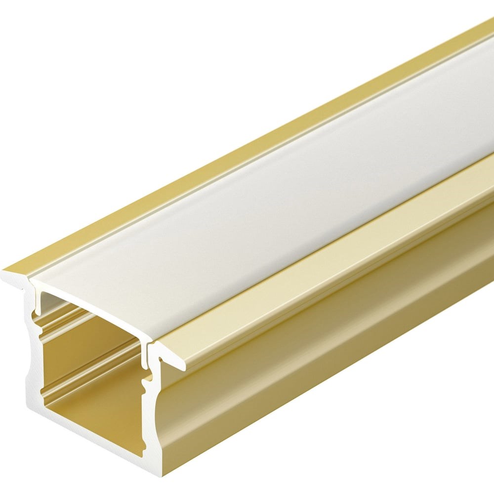 Алюминиевый анодированный встраиваемый профиль для светодиодных лент и линеек. Цвет - золотой. Паз для установки 17 мм. Ширина площадки для ленты 12 мм. Экраны, заглушки и другие аксессуары приобретаются отдельно.