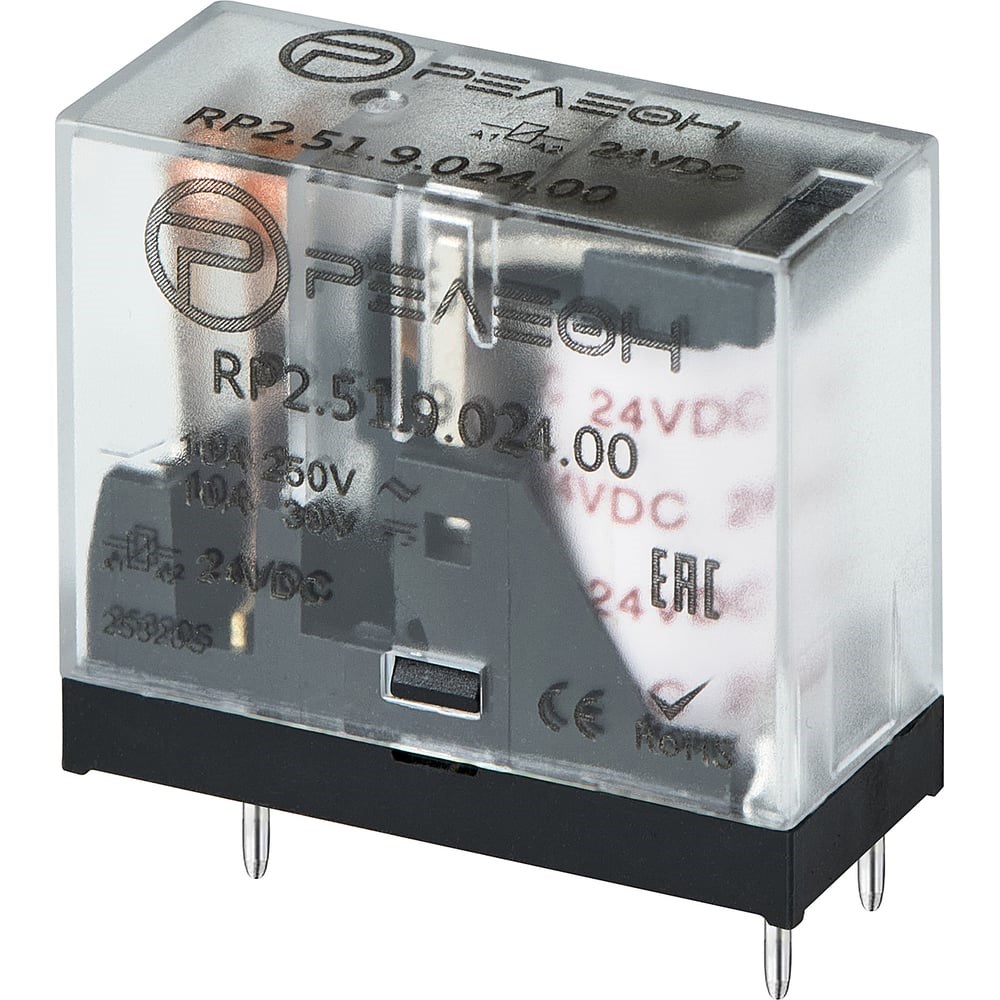 Миниатюрное промежуточное реле RP2.51.9.024.00Назначение:Промежуточные реле RP2 предназначены для работы в электрических цепях управления и промышленной автоматикипеременного тока напряжения 250В частотой 50Гц и постоянного тока напряжения до 220В.Служат для передачи команд управления исполнительными элементами между силовыми цепями и цепями управления.Крепление:Крепятся на 35-мм монтажную DIN-рейку с помощью розеток серии S2. На розетке располагаются зажимы выводов,переключающих контактов и катушек.
