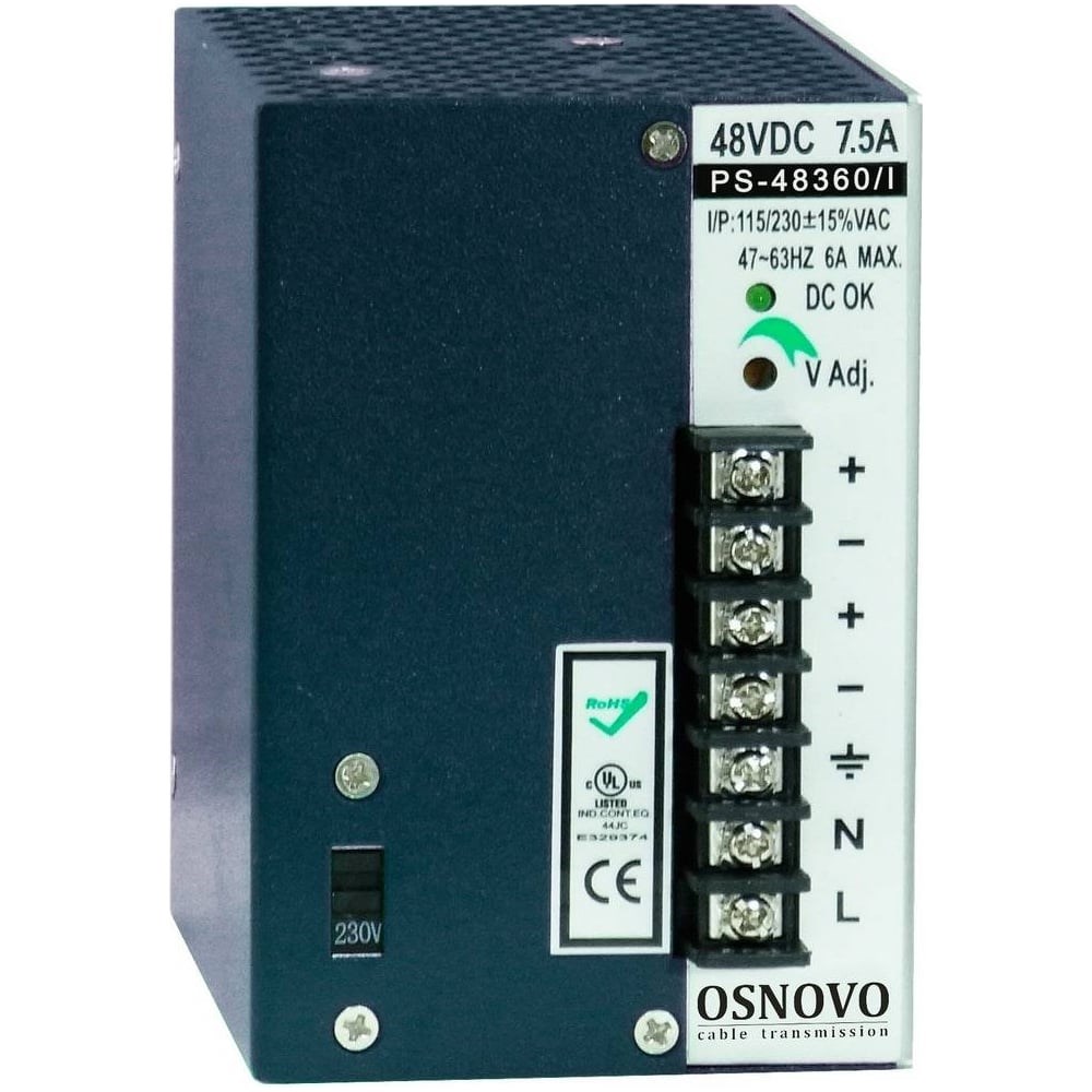 Промышленный блок питания. DC48V, 7,5A (360W). Диапазон входных напряжений: AC195-265V. КПД: 83%. Регулировка выходного напряжения в диапазоне 44-53V. Защита от короткого замыкания, перенапряжения и перегрузки. Принудительная система охлаждения (вентилятор). Монтаж на DIN-рейку или стену. Размеры (ШxВxГ): 75x110x121мм. Рабочая температура: -40...+50°C.