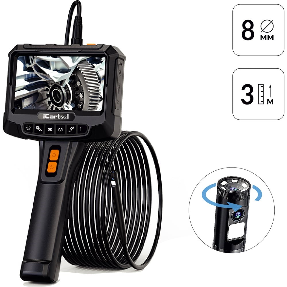 Промышленный видеоэндоскоп с вращением камеры iCartool IC-VC700R имеет 2 камеры и экран с разрешением HD, матрицей IPS и диагональю 5”. Главная особенность видеоэндоскопа – возможность управлять положением боковой камеры, вращая её на угол до ±350 градусов для кругового обзора с помощью кнопок.Зонд эндоскопа съемный, полужесткий, хорошо держит форму, имеет длину 1 м и диаметр 8 мм. . Камеры с разрешением 2 Мп и углом обзора 70° обеспечивают качественную картинку, а цифровой зум помогает рассмотреть мелкие детали. Переключение между камерами, а также использование дополнительных функций происходит с помощью кнопочной панели управления.Регулируемая LED подсветка обеспечивает возможность детального осмотра объекта. Встроенная литиевая батарея позволяет работать до 3х часов без подзарядки.Особенности:Вращение камеры бокового обзора на 350° по или против часовой стрелки вокруг оси зонда2 камеры: фронтальная и боковая; разрешение камер 2МпЭкран 5” с матрицей IPS и разрешением HD (1280х720)Съемный полужесткий зонд диаметром 8 мм и длиной 3 мФоторежим с сохранением изображения в формате JPG (1920x1080)Фокусное расстояние от 2 до 10 см для торцевой камерыLED подсветка, 8+1 светодиодами, 3 режима яркостиФункция записи фото- и видеофайлов на карту памяти. Поддержка карт памяти до 64 ГБРаботает до 3 часов от собственного аккумулятора объемом 2000 мАч