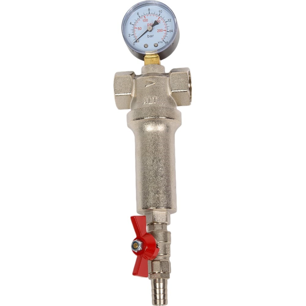 Фильтры ALTSTREAM применяются для очистки потока жидкости от нерастворимых механических примесей в системах трубопроводов горячей и холодной воды, сжатого воздуха, масла и жидких углеводородов при температуре транспортируемой среды до 110 °C и давлении до 16 бар. - дренажный кран со штуцером под шланг позволяет осуществлять как прямую, так и обратную промывку фильтра; - манометр, входящий в комплект фильтра, позволяет узнать давление в системе в статическом режиме, а также давление до фильтра в динамическом режиме. В колбе расположен фильтроэлемент (100мкм) из нержавеющей стали AISI306, который зафиксирован в корпусе с помощью тефлоновой обоймы.