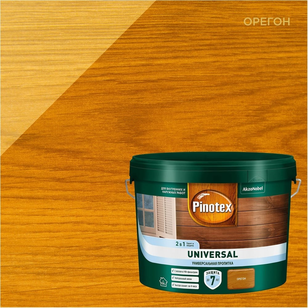 Пропитка 2 в 1 Pinotex UNIVERSAL орегон, 9 л 5620548 - универсальная пропитка на водной основе для защиты древесины на срок до 7 лет*. Для обработки древесины снаружи и внутри помещений. Формула 2 в 1.Наносится без грунта, питает и защищает от влаги, загрязнений и атмосферного воздействия. Усилена УФ-фильтром для защиты от выгорания. С воском для дополнительной влагостойкости. Паропроницаемое «дышащее» покрытие – не задерживает влагу внутри древесины. Запах нейтральный, легко наносится и быстро сохнет. Низкое содержание ЛОС (Летучие Органические Соединения). Сохраняет видимой текстуру древесины, полуматовая. Для дополнительной защиты от плесени и грибка при наружных работах используйте грунт Pinotex Base.Область примененияДля наружных работ: деревянные фасады, беседки из бруса, вагонки, планкена, а также окна, двери, скамейки и столешницы. Для внутренних работ: потолки, стены из бруса, бревен, вагонки, мебель. Допускается окрашивание деревянного пола с последующим нанесением яхтного лака Pinotex Lacker Yacht.Особенности примененияОбрабатываемая поверхность должна быть сухой (влажность менее 18%), чистой. Работы рекомендуется проводить в безветренную погоду при температуре воздуха не ниже +10°C и не выше +30°C с относительной влажностью воздуха не более 80%.Деформация древесины в процессе усадки или несоблюдение условий нанесения может привести к нарушению целостности покрытия, в этом случае проведите ремонтные работы по его восстановлению.