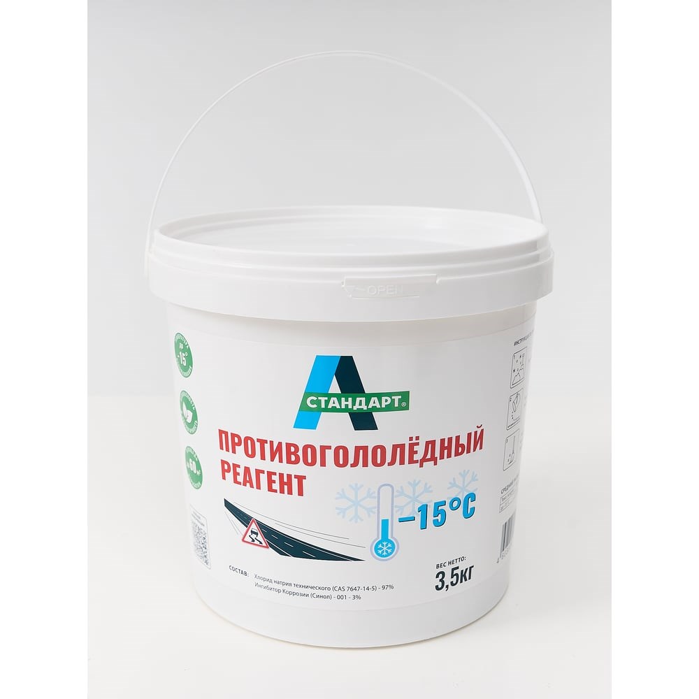 Противогололедный реагент А-Стандарт -15C ведро 3.5 кг 01-00004745 экономичный и эффективный противогололедный реагент, который отлично работает в условиях мягкой зимы. Позволяет разрушить небольшую наледь и предотвратить её появление вновь, за счет чего отличается практичностью. Предназначен для обработки дорог, улиц, дворовых территорий, пешеходных, парковочных зон и тротуаров. Дополнительные характеристики: Хранение: хранить отдельно от пищевых продуктов, в недоступных для детей и домашних животных местах. В неповрежденной упаковке, в крытых помещениях, исключающих попадание влаги. Состав: хлорид натрия 98%, ингибитор коррозии. Площадь обработки: 50 кв. метров.