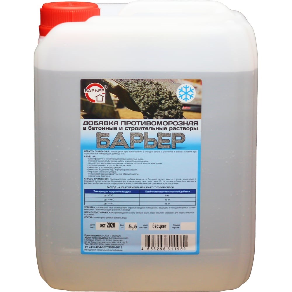 Противоморозная добавка в бетонные и строительные растворы БАРЬЕР канистра 5,5 кг 4665296514608 помогает получить прочный и долговечный бетон при зимних строительных работах (до -15°С). Специальный комплекс присадок снижает температуру кристаллизации воды и ускоряет ударный набор прочности. Кроме того, «Противоморозная добавка БАРЬЕР» действует как стабилизатор и пластификатор, препятствует появлению дефектов (расслаивания, трещин, отхождения арматуры). Состав позволяет сократить расход цемента, одновременно улучшая характеристики раствора.