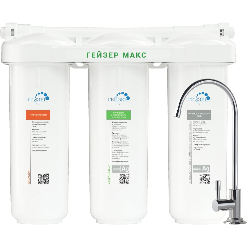 Трехступенчатый фильтр Гейзер Макс 16024 служит для максимального умягчения воды при помощи сочетания свойств специальной ионообменной смолы в картриджах AquaSoft и Арагона МАКС. Фильтр прост в установке, выполнен из непрозрачного пищевого пластика. Изделие с тремя ступенями очистки очищает воду от железа - 92%, хлора – 99,9%, меди – 97%, цветности, запахов и привкусов – 100%.