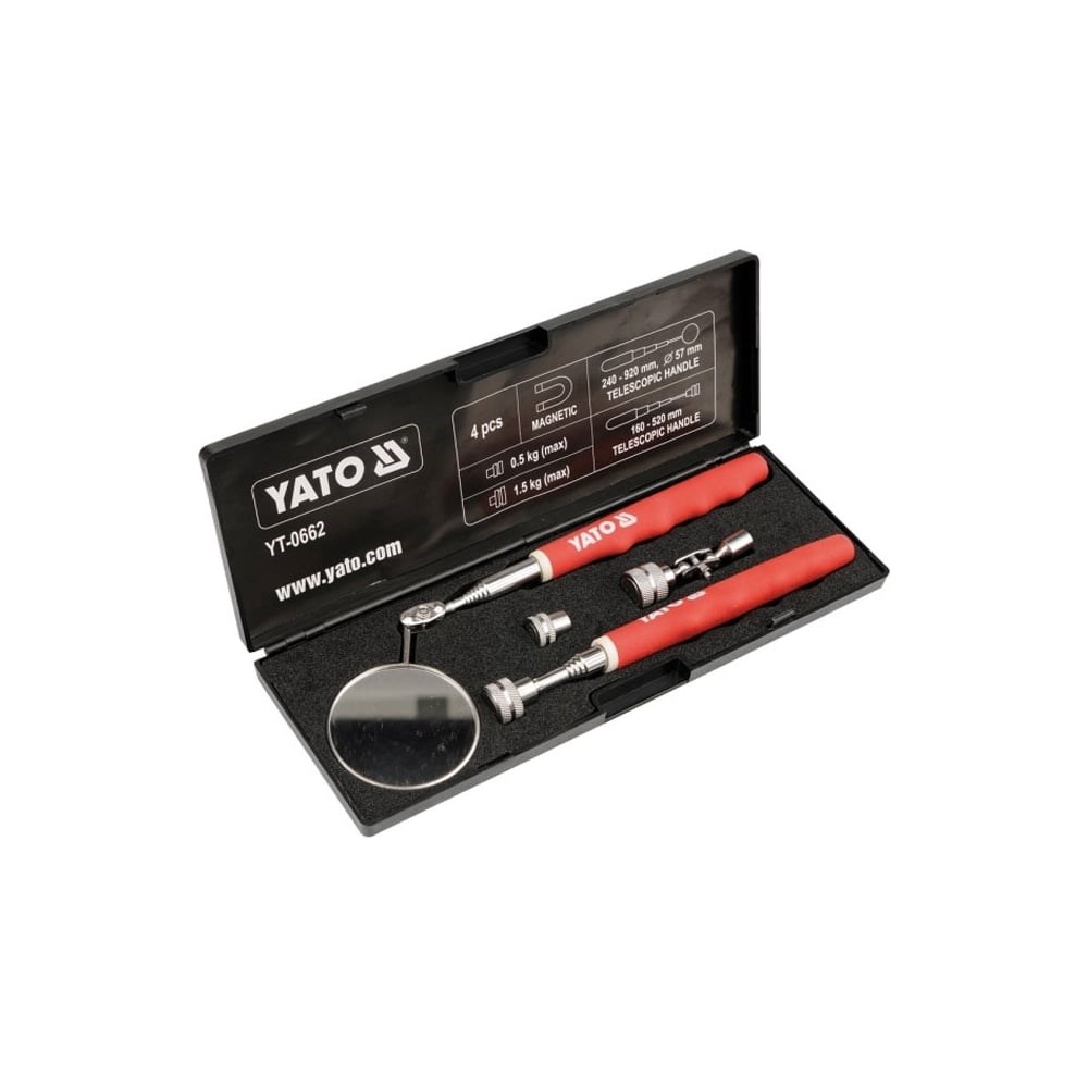 Проверочный набор YATO держатель и зеркало YT-0662 используется в профессиональных мастерских и сервисах различных отраслей. Смотровое зеркало позволяет контролировать невидимые, скрытые места, а магнитный захват используется для извлечения небольших металлических предметов из зазоров и отверстий. Зеркало и захват имеют телескопические рукоятки для удобства работы.