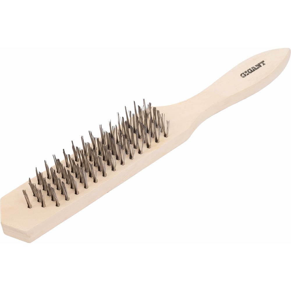 Проволочная щетка Gigant 5 рядов проволоки деревянная рукоятка GB-5 выполнена из прочной стали, заправленной в деревянный бандаж. Конструкция используется для удаления загрязнений, ржавчины и старой краски с металлических поверхностей.