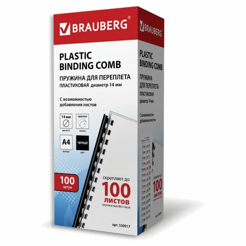 Пружины пластиковые для переплета, КОМПЛЕКТ 100 шт., 14 мм (для сшивания 81-100 л.), черные, BRAUBERG, 530917