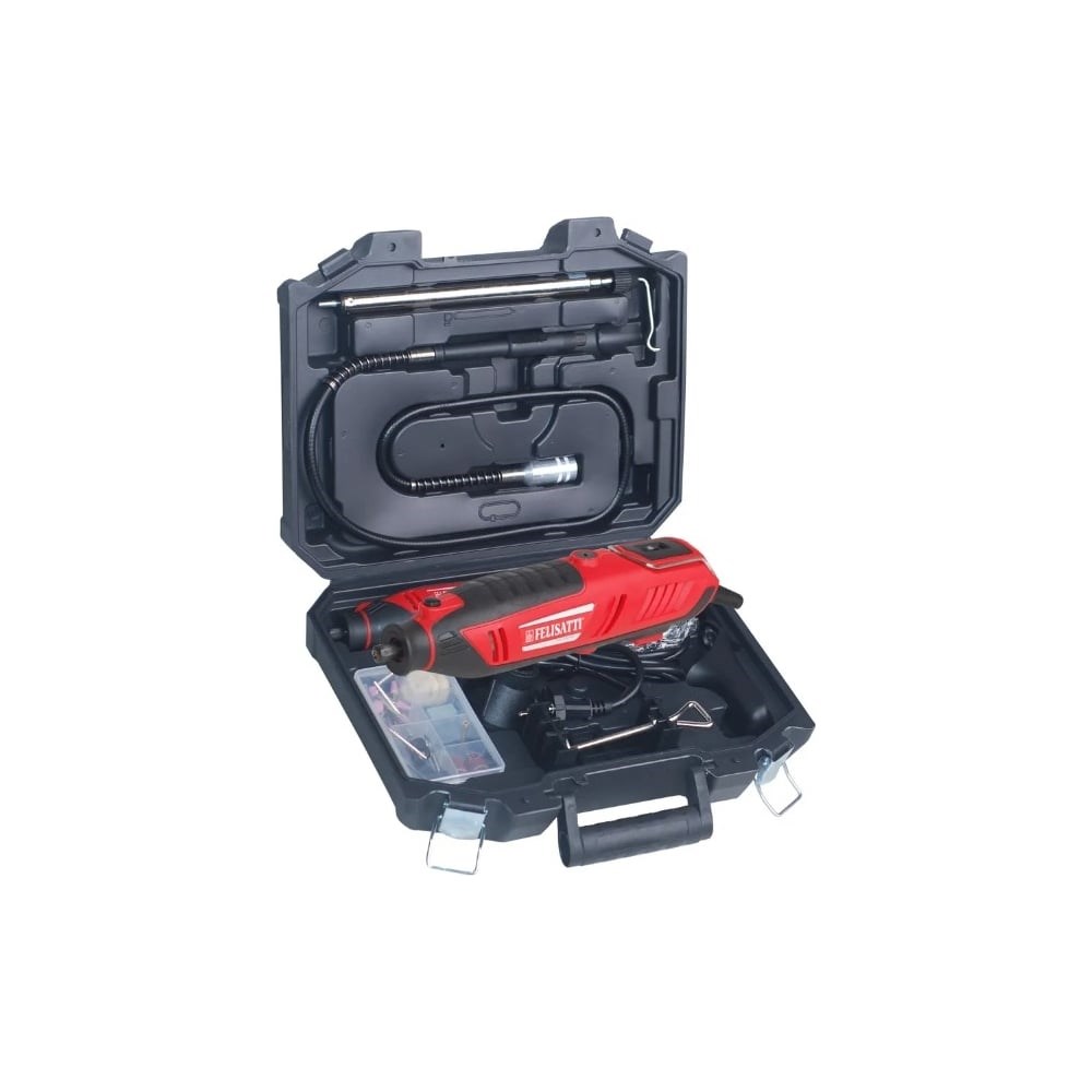 Микрошлифмашина предназначена для качественной полировки, гравировки, фрезерования и шлифовки различных материалов. Имеет регулятор оборотов, благодаря которому можно выбрать нужную скорость от 8000 до 35000 об/мин. Это позволяет подобрать оптимальный режим работы для каждого конкретного материала, подстраиваясь под его тип и степень твердости. Комфортно удерживать в руке благодаря удобному корпусу. Он имеет прорезиненные накладки и рифление, которые повышают сцепление с рукой оператора, защищают машину от выскальзывания и улучшают контроль над инструментом. К тому же, резина поглощает часть вибрации, позволяя оператору меньше уставать при длительной работе. Для выполнения высокоточных работ, в комплектации имеется гибкий вал, позволяющий использовать шлифовально-гравировальную машину стационарно. Быстрый доступ к щеткам позволяет быстро и без особых трудностей поменять щетки и продолжать работу. Дополнительное оснащение дает возможность расширить применение инструмента: возможность установки на дополнительную штангу позволяет использовать шлифовально-гравировальную машину стационарно, что максимально увеличивает удобство, высокую точность при работе с гибким валом в труднодоступных местах; стационарная фрезерная насадка/упор/основа позволяет производить мелкие фрезерные работы с необходимым оснащением; защитный прозрачный кожух и дополнительная рукоятка позволяет более точно, длительно и безопасно использовать инструмент в самых разных условиях работы.