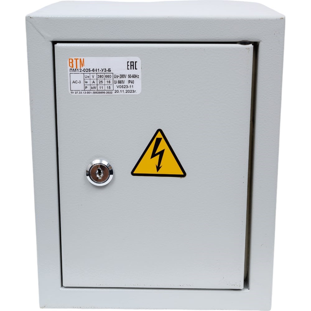 Пускатель ВТМ (S) ПМ 12-025641-25А-380АС-(4з+6р)-РТЛ1022-2(17,0-25,0А)-У3-Б 0072266 ВТМ00072266 - устройство дистанционного управления, предназначенное для частых включений и отключений электрических цепей. Предназначен для работы на переменном токе при напряжении сети до 660 Вольт и частоте 50-60 Гц. Применение: управление электродвигателями, электрооборудованием кранов, в стационарных установках микропроцессорной техники. С помощью реверсивного пускателя можно изменять направление вращения электродвигателя (реверсивный пускатель ПМ12 состоит из двух нереверсивных, которые объединены в один). Разновидность устройства с тепловым реле служит для защиты от перегрева при длительных, но небольших токовых перегрузках. Внимание! Фотография товара является условной, при выборе ориентируйтесь на технические характеристики.