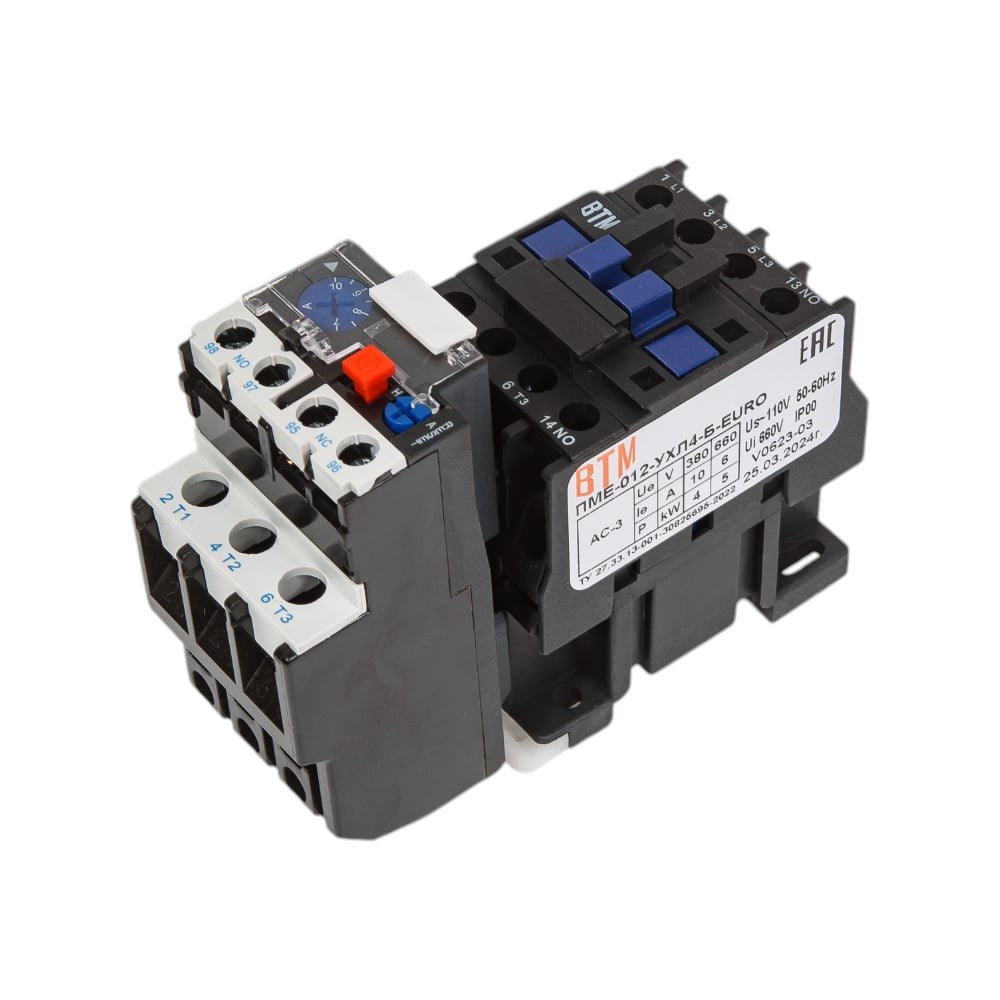 Внимание! Фотография товара является условной, при выборе ориентируйтесь на технические характеристики. Пускатель ВТМ (S) ПМЕ-012-10А-110АС-(1з)-РТЛ1014-2(7,0-10,0А)-УХЛ4-Б-EURO ВТМ00073721 - коммутационный аппарат для удаленного управления электромагнитными устройствами, работает в цепях с напряжением 660В и частотой 50 и 60 Гц. Тепловое реле осуществляет защиту управляемых электродвигателей от перегрузок недопустимой продолжительности. Допустимая частота включений при режиме нормальных коммутаций при продолжительности включений ПВ 40-600 вкл./час. Допустимая частота включений без тока в главной цепи - 1200 вкл./час. Механическая износостойкость нереверсивных пускателей (без тока в цепи контактов, частоте включений 1200 в час) составляет не менее 6 млн. циклов. Коммутационная износостойкость контактов главной цепи в режиме АС-3 (600 вкл./час) не менее 2 млн. циклов.