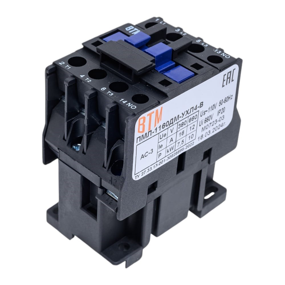 Внимание! Фотография товара является условной, при выборе ориентируйтесь на технические характеристики. Пускатель ВТМ (S) ПМЛ-1160ДМ-16А-110АС-(1з)-УХЛ4-В ВТМ00039465 - коммутационный аппарат для удаленного управления электромагнитными устройствами. Пускатель ПМЛ серии работает в цепях с напряжением 660В и частотой 50 и 60Гц. Применение: для пуска и остановки электродвигателей; в комплектации с тепловым реле для предотвращения перегрузок. Допустимая частота включений при режиме нормальных коммутаций при продолжительности включений ПВ 40-600 вкл./час. Допустимая частота включений без тока в главной цепи - 1200 вкл./час. Коммутационная износостойкость контактов главной цепи в режиме АС-3 (600 вкл./час) не менее 2млн. циклов.