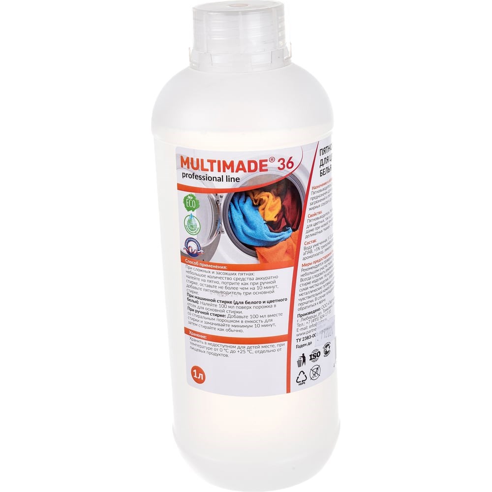 Пятновыводитель для цветного белья Мультимэйд 36 предназначен для удаления сложных загрязнений и пятен от вина, макияжа, кофе, жирных соусов и др. Безопасен как для цветных, так и для белых тканей.Перед использованием рекомендуется проверить прочность окрашивания на небольшом участке ткани.Способ примененияПри сложных и засохших пятнах небольшое количество средства аккуратно налейте на пятно, потрите, как при ручной стирке, оставьте не более чем на 10 минут. Затем добавьте пятновыводитель при основной стирке.При машинной стирке (для белого и цветного белья): налейте 100 мл поверх порожка в отсек для основной стирки.При ручной стирке: добавьте 100 мл вместе со стиральным порошком в емкость для стирки и замачивайте минимум 10 минут, затем стирайте, как обычно.