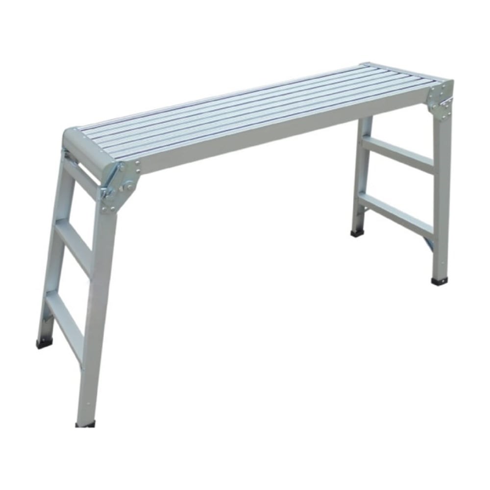 Рабочая платформа алюминиевая шарнирная- представляет собой свободностоящую переносную платформу, состоящую из трех секций, соединенных между собой стальными шарнирами. Профиль платформы изготовлен из высокопрочного алюминиевого сплава (ГОСТ 22233-2018), что обеспечивает прочность и долговечность при минимальном весе. Ступени имеют рифленую противоскользящую поверхность, что способствует безопасному подъёму и спуску.Рабочая платформа - незаменимый помощник во время стройки или ремонта. Предельно допустимая нагрузка – 150 кг. Подобные конструкции необходимы как для дома, так и для промышленных малярных или штукатурных работ.Размер рабочей площадки: 1,01х0,45 м.Завод – изготовитель оставляет за собой право в одностороннем порядке вносить изменения в конструкцию, в целях улучшения технических характеристик.на линейные размеры отклонение может составлять +-5 мм, на вес изделия +-5%