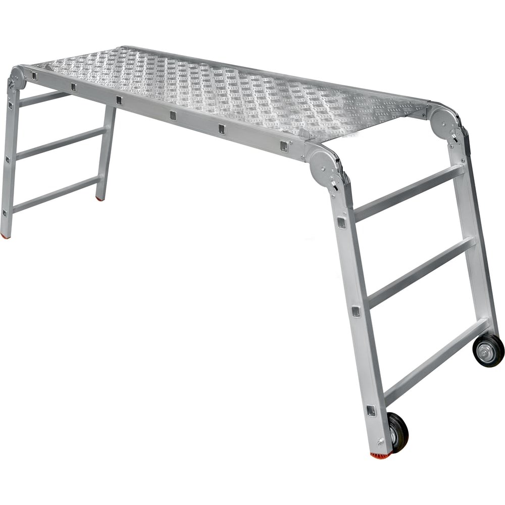 Рабочие подмости с металлическим помостом, 3x6x3 Новая Высота 3341363 - универсальное приспособление, которое сочетает в себе сразу три изделия - приставная лестница, помост, а также приставная согнутая лестница. Модель широко используется на заводе или складах. Благодаря колесам конструкция легко и быстро перемещается по рабочей площадке. Рифления на ступенях обеспечивают безопасность в эксплуатации. Рабочая высота - 282 - 411 см. Ступени - 3х6х3.